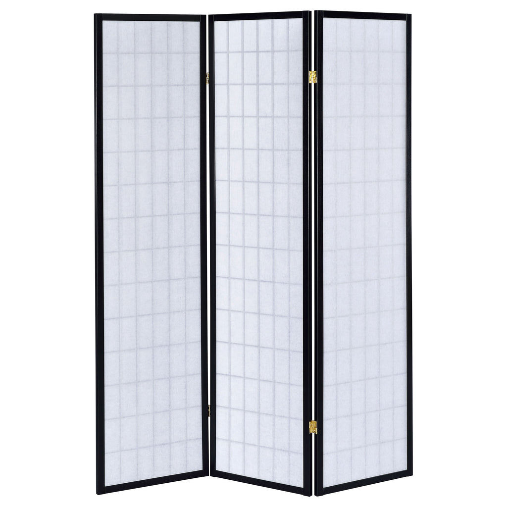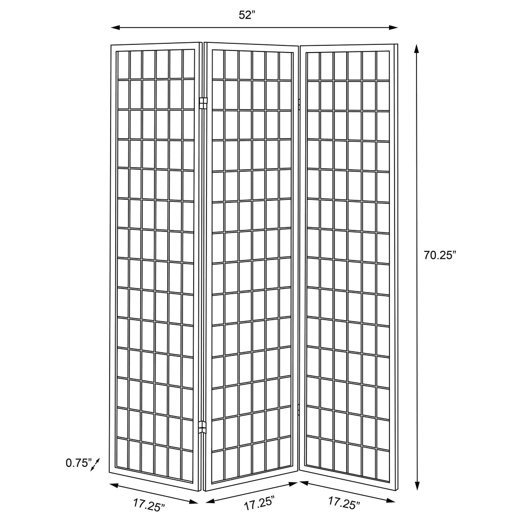 This three-panel room divider brings timeless elegance and versatile function to any living area. A classic Shoji screen design with crisp white panels and linear grid details offers both privacy and subtle style. Built with a sturdy rubberwood frame and durable fabric inserts, it provides lightweight portability and lasting quality. Ideal as a decorative backdrop or partition, this folding screen enhances bedrooms, living rooms, or home offices with understated charm. Key Features: • Three panel room divider in black finish, linear grid, folding hinges, solid pine frame • Three panel design in black finish, white fabric panels, grid lattice, lightweight fold • Folding design in black finish, brass tone hinges, solid pine frame, durable fabric inserts • Black finish with white inserts, stable three way hinges, solid pine and fabric build • Black finished solid pine frame with polyester rayon panels, easy fold for quick repositioning • Black finish, crisp grid detail, fabric inserts diffuse light, solid pine adds stability