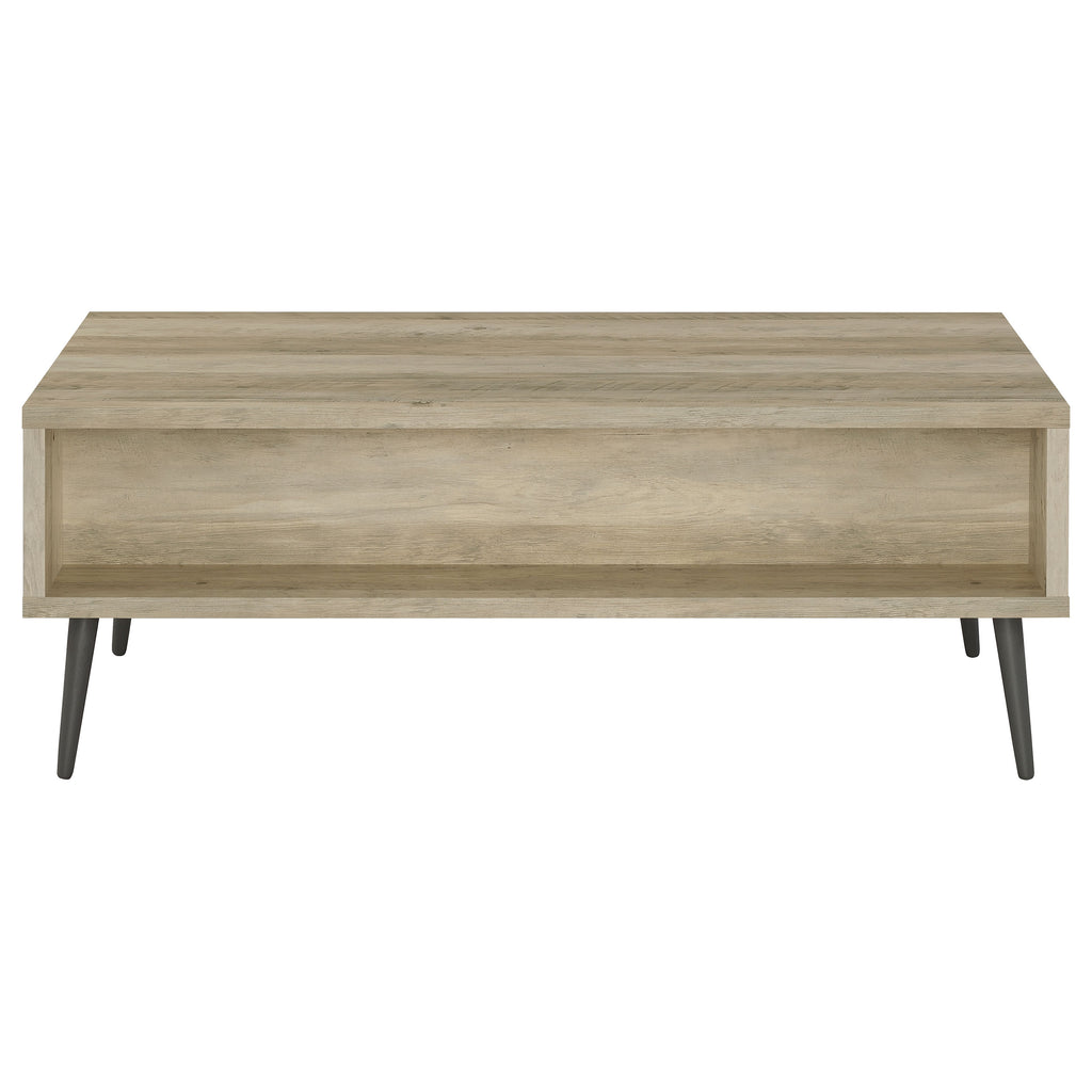 Go retro with a pleasing look in casual interior design, adding a tasteful and practical coffee table. This wood cocktail table fits beautifully in an easy-living family room or living room, offering a versatile palette. A rectangular silhouette is tasteful and unusual, constructed of distressed pine finish engineered wood and rubberwood. A deep gray drawer front opens to reveal hidden storage space, as a wide open compartment is ideal for periodicals and books. Tapered rounded legs add a nod to retro influence. Key Features: • Coffee table with distressed pine wood-look finish and engineered wood construction • Drawer with a grey front offers concealed storage for tidier spaces • Black powder-coated metal legs provide sturdy support and a contemporary touch • Open shelf below for easy access to your living room essentials • Scratch-resistant laminate veneer surface ensures lasting durability • Simple, minimalist design that complements modern living room setups