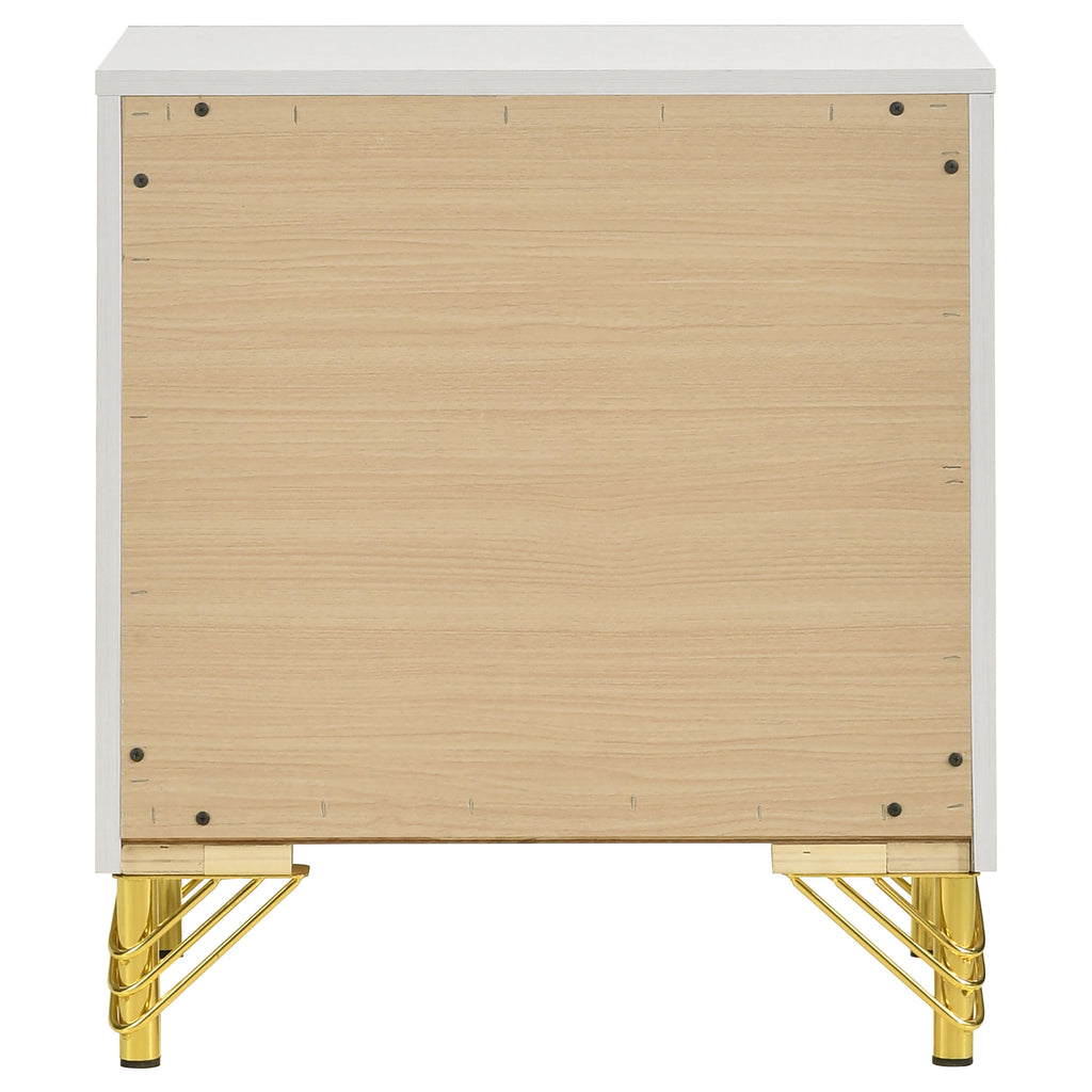 Gleaming gold trim captures attention on a modern two-drawer nightstand. Perfect for your sophisticated bedside, it boasts a bright white finish case that offers the perfect touch of depth with its gold trim. A pair of long bar pulls decorate drawer fronts. Hairpin style legs offer vintage flair and exceptional elegance. Two drawers add plentiful bedside storage, offering a place to ruck away personal items and overnight essentials.