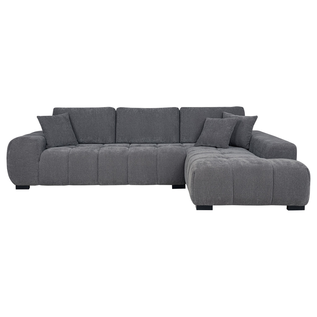 Embrace comfort and timeless style with this mid-century inspired sectional sofa. Designed for relaxed lounging, it showcases wide, rounded arms and plush waterfall seat cushions adorned with subtle grid tufting. Soft, neutral upholstery envelops a sturdy frame, ensuring lasting quality. Reversible back cushions and supportive accent pillows let you effortlessly customize your seating experience. The result is a captivating centerpiece that elevates any living area’s ambiance.