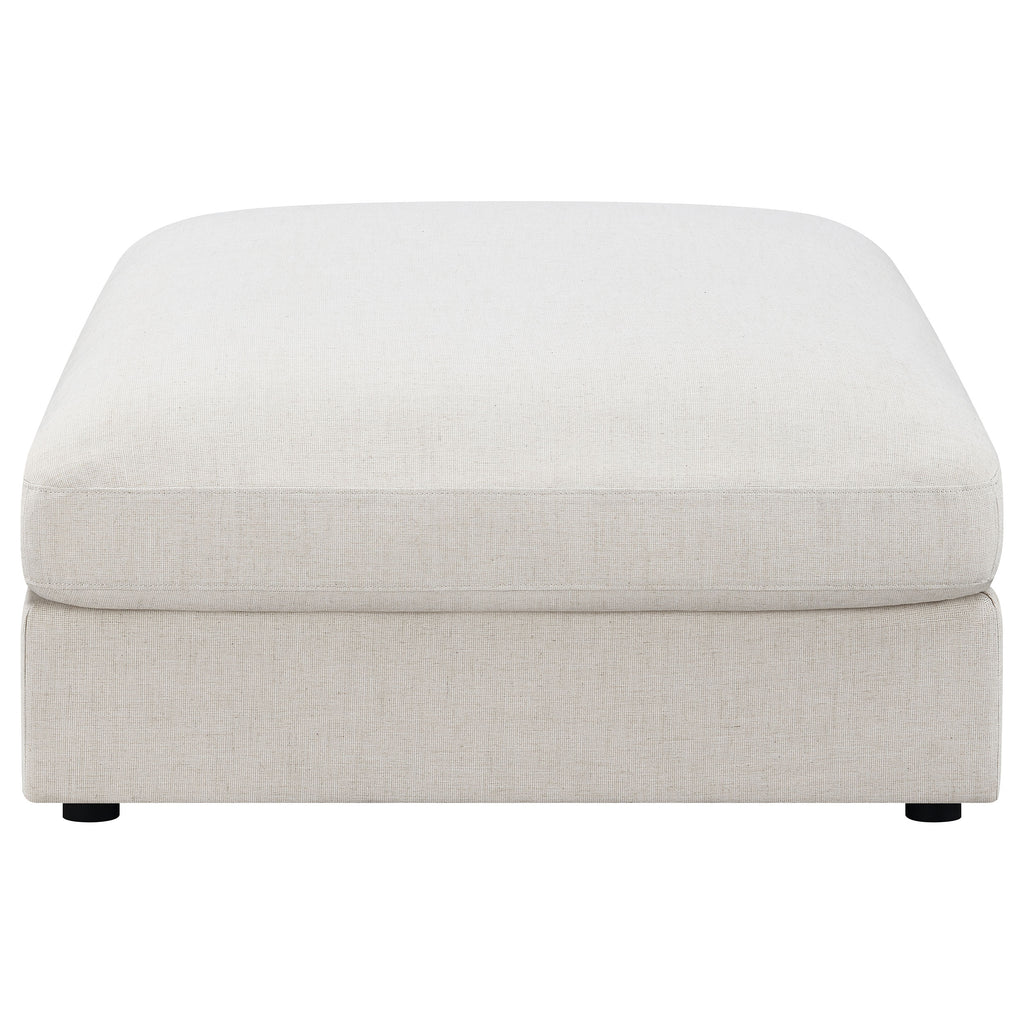 Covered in a linen-like fabric all around, this super comfy six-piece sectional offers all the seating you need in an open concept living room or entertainment area. Designed with three armless chairs, two corner chairs and a single oversized ottoman, this contemporary modular sectional offers reversible back pillows and jacquard accent pillows that you can really sink into. Black feet peer from beneath, offering a slight elevation for rugs and other flooring. With an L-shape design, this sectional works in a variety of room dimensions. A spacious ottoman also doubles as a coffee table, keeping a tray of refreshments and snacks when hosting guests.