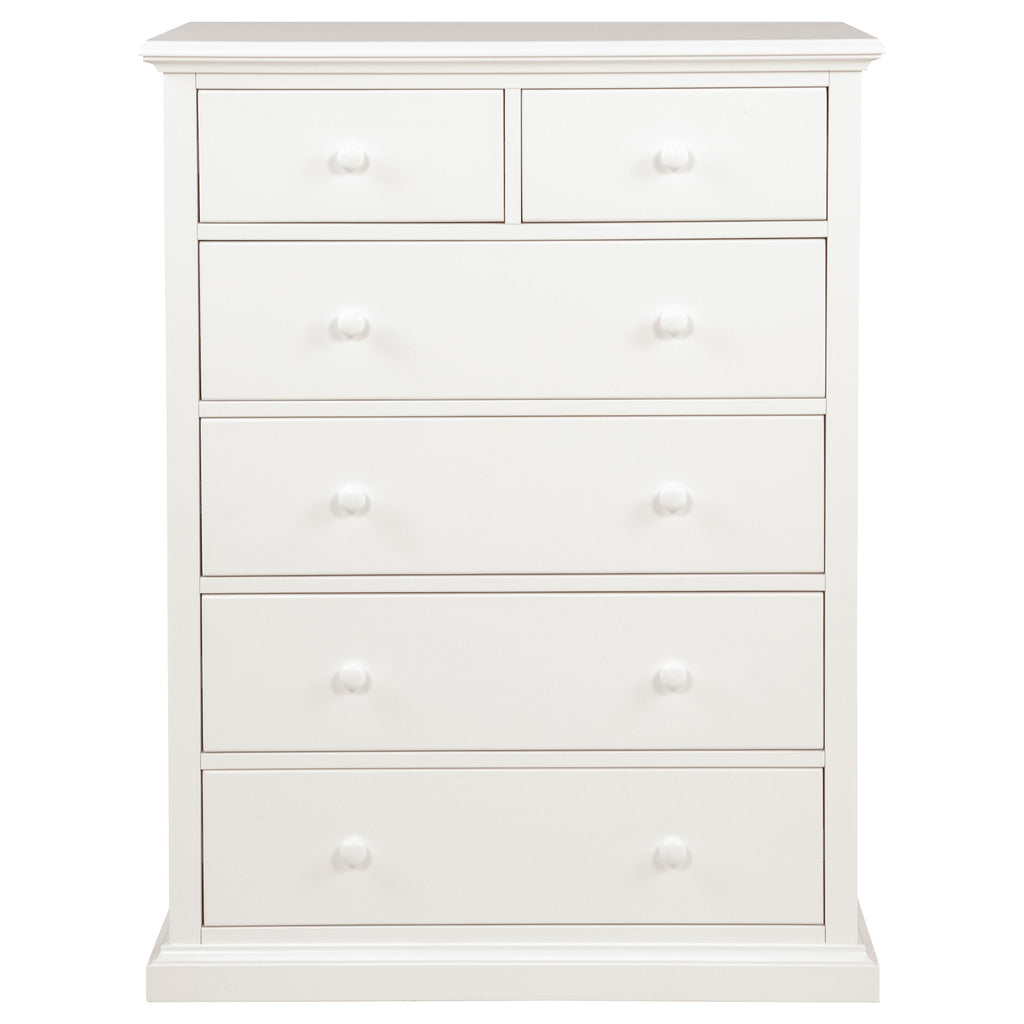 This elegant six-drawer chest combines practicality and style with its timeless design, perfect for bedrooms or guest spaces. Constructed from sturdy plywood and engineered wood with pine and pine veneer accents, this chest of drawers ensures durability and visual appeal. The six spacious drawers offer convenient storage, while the minimalist round knobs and clean lines enhance its sleek silhouette. Its compact design is ideal for organizing essentials without occupying excessive space.