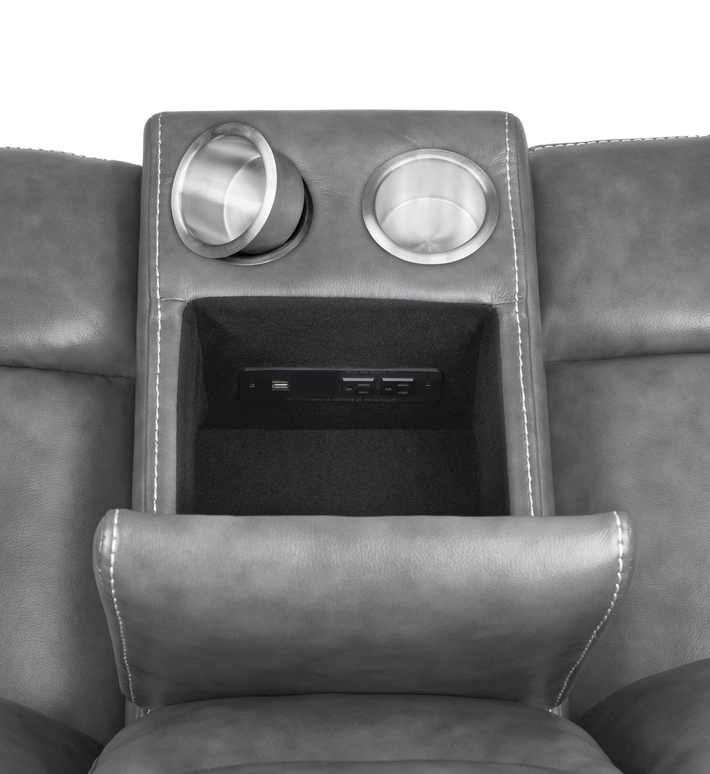 Experience the perfect blend of comfort and functionality with this reclining sofa set, upholstered in smooth grey faux leather for a contemporary appeal. Designed for relaxation, each piece features plush cushioning, padded headrests, and supportive armrests. The collection includes thoughtful upgrades like drop-down tables with cup holders, power outlets, hidden storage, and cool gel memory foam seating. Built with durable metal and plywood framing, this set redefines everyday comfort in modern living spaces._x005F_x000D_ Key Features: • Two-piece reclining sofa set crafted for modern living comfort • Smooth grey faux leather upholstery delivers sleek visual appeal • Sofa includes drop-down table with power outlets and storage • Loveseat console adds dual cup holders and hidden compartments • Cool gel memory foam topper provides lasting seat cushioning • Durable metal and plywood framing ensures long-term stability