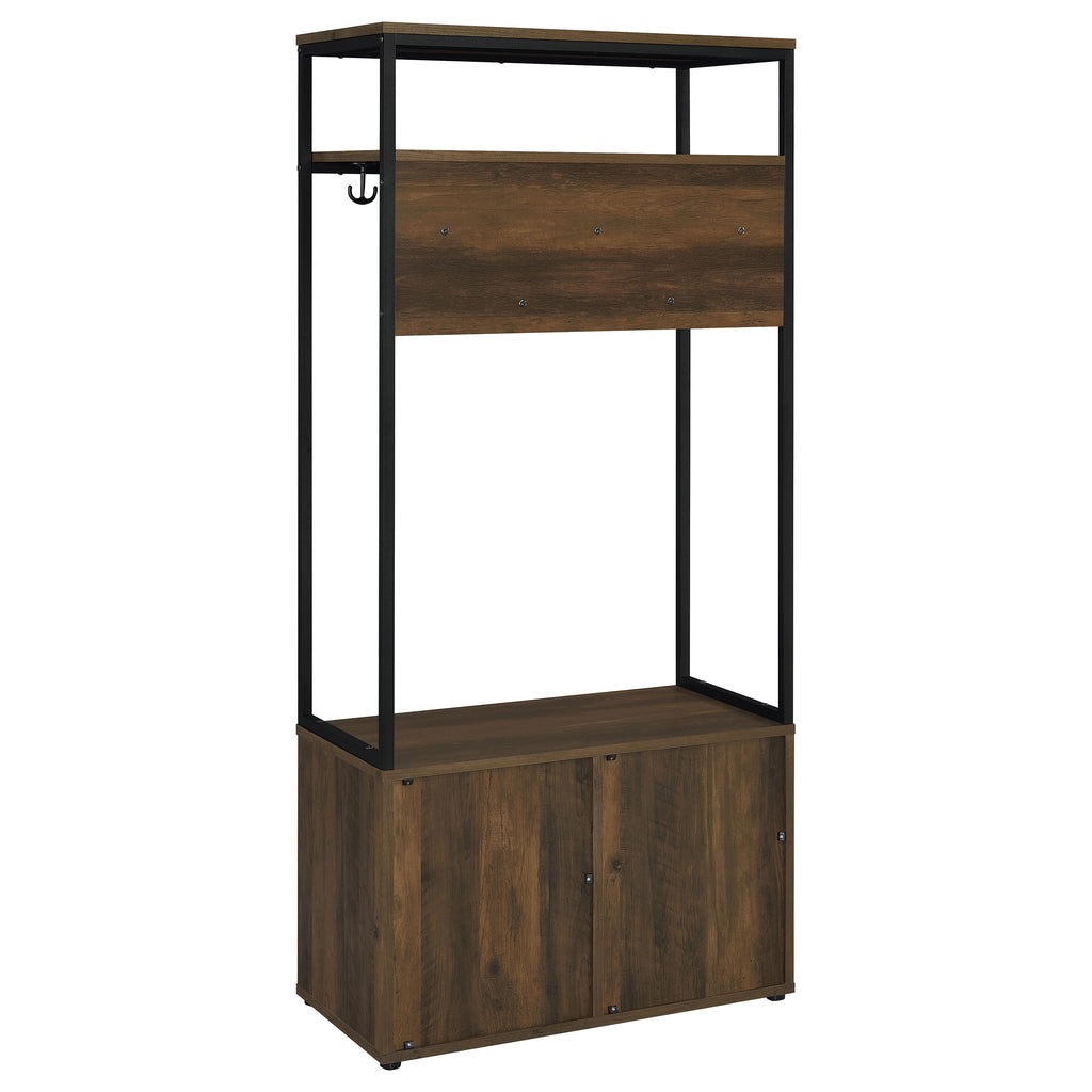 Your functional living space keeps clutter away with a rustic hall tree offering ample room for storage. Perfect for a transitional entryway or mud room, this hall tree features a lower cabinet and upper board made of rich dark pine finish wood products. Industrial inspiration adds black finish metal framing in a linear mode, adding an upper shelf for storage and a tray surface above its cabinet. Find four shelves behind two cabinet doors, ideal for concealing shoes and accessories. Hang coats, hats, and scarves on seven hooks, making them accessible with a quick reach.
