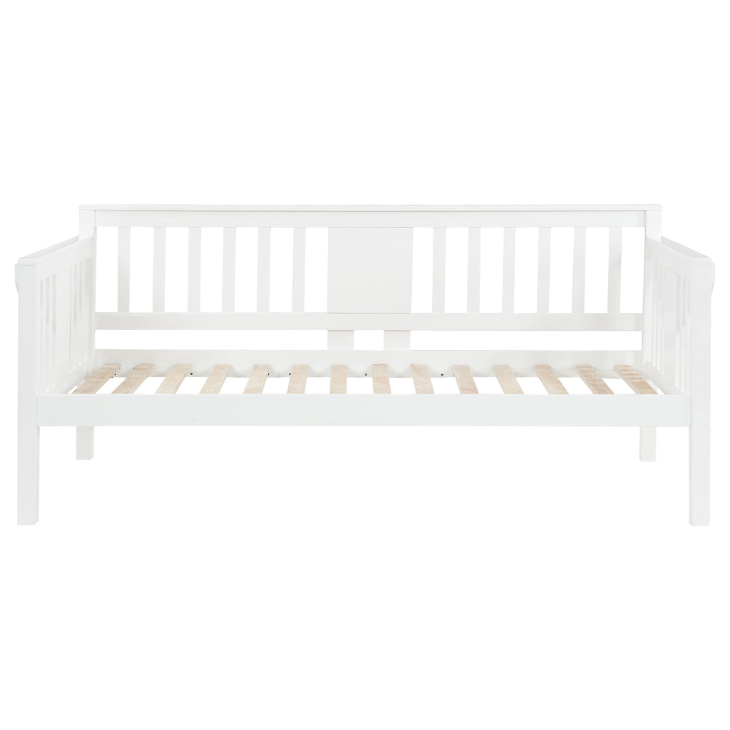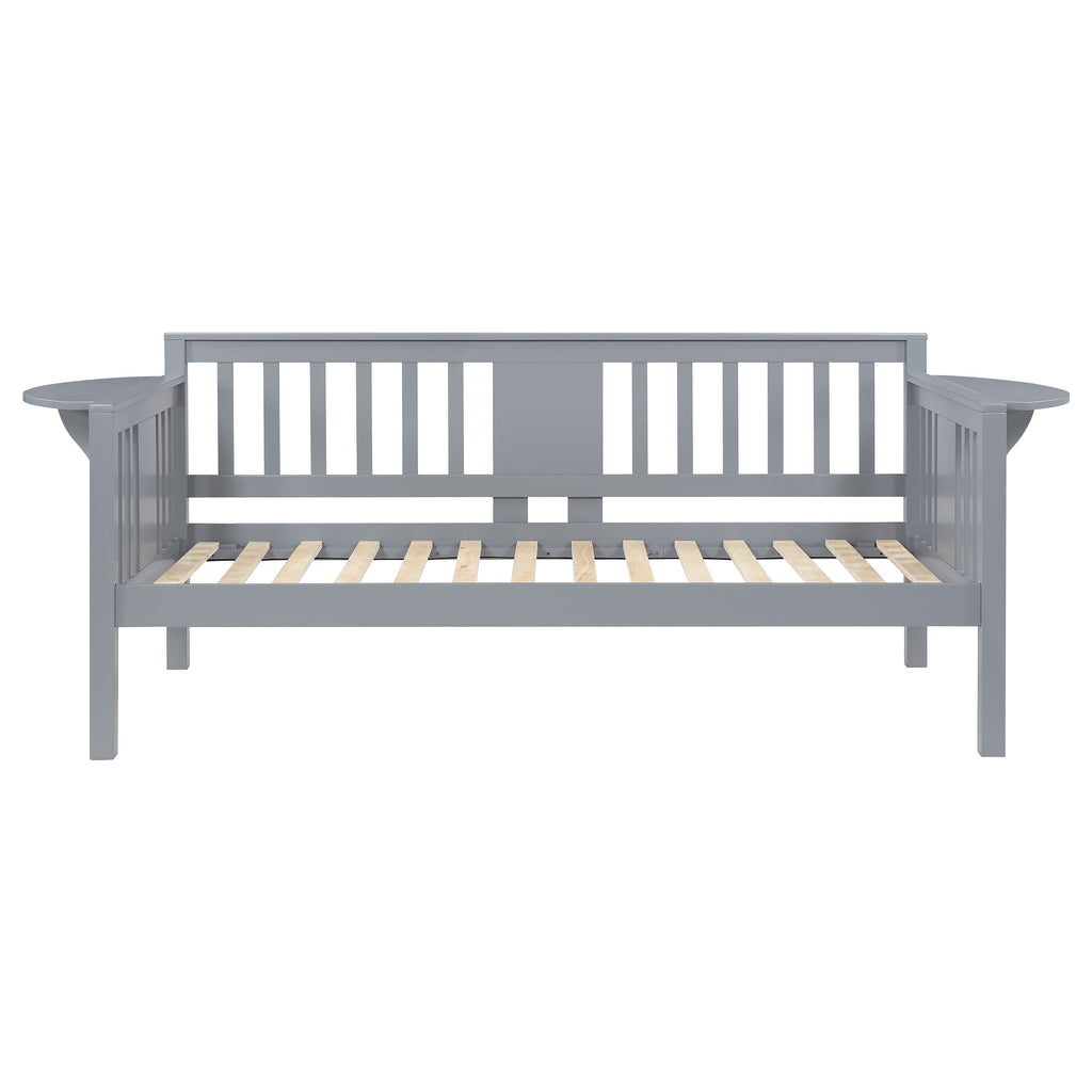 Create a spot to relax in your home office or freshen up a teen's bedroom with a contemporary wood daybed. Perfect for a casual look and feel, it features a neutral finish over pine and plywood construction, offering classic energy in an updated package. The bed features a vertical slat framework, complete with solid panel accents on three sides. Each side of the daybed includes a drop-down panel, creating a compact tabletop surface perfect for stashing essentials like your phone or a great book. A daybed offers impressive versatility, with a stylish look that works for lounging or sleep.