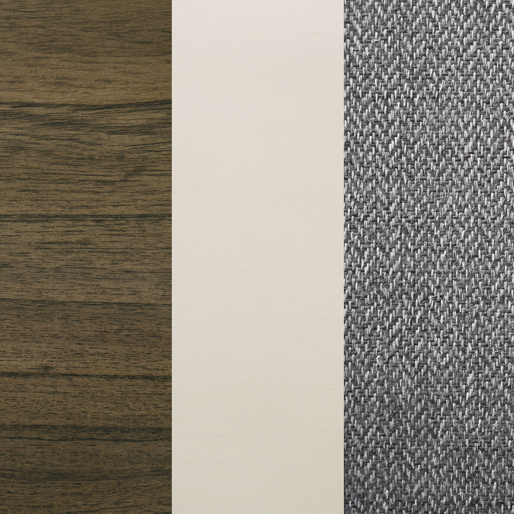 Refresh a family dining space with the cool hues and eye-catching design of this modern dining set. It includes a rectangular table and side chairs, creating an inviting centerpiece in your dining room or eat-in kitchen. The table boasts a two-tone finish with a rich wood grain tabletop complete with rounded corners, and a white finish base with chic angularity. Chairs are plush and comfortable, complete with gray fabric upholstery over plush cushions that create streamlined aesthetics in your space. The tri-tone combination is fresh and inviting, perfect for a welcoming space to catch up with friends and family.