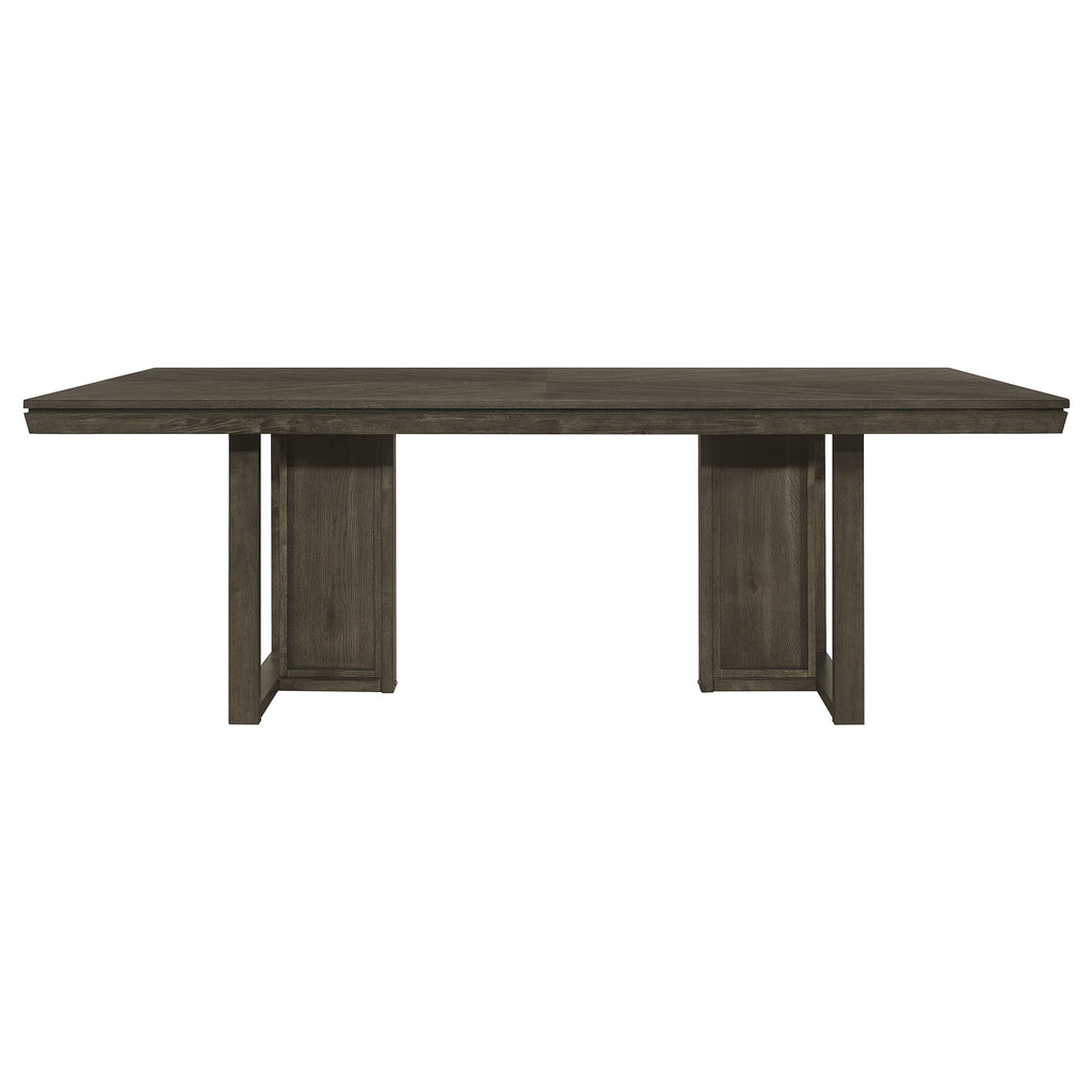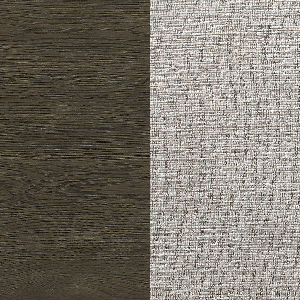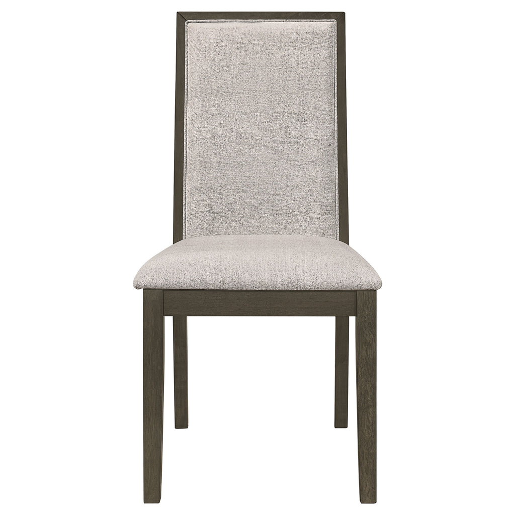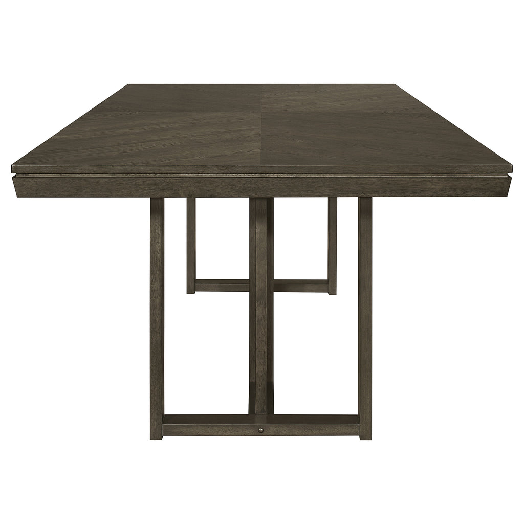 Upgrade your dining area with this chic transitional dining set, featuring a sleek dark grey finish and subtle chevron pattern on the table top. The table boasts a clean and simple trestle base design, while the chairs offer comfortable beige upholstered back and seat. The server has ample storage with three drawers and two shelves, including brown felt-lined top drawers.