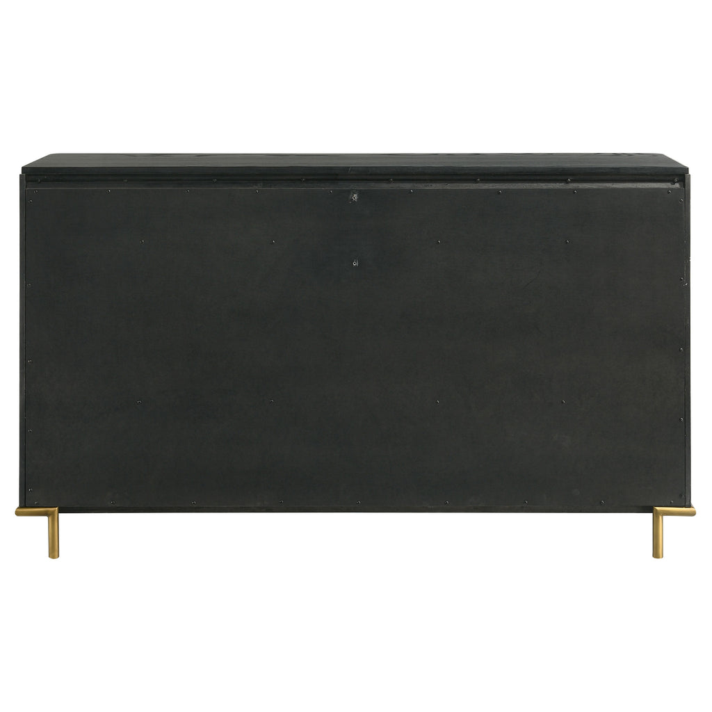 Graceful lines are enhanced with the wire brushed finish and wood grain details of a modern dresser. Eight drawers create ample storage and organization for clothing and linens, helping to keep your bedroom tidy and organized. Top drawers are lined with felt to offer protection for delicates and other precious items. Each drawer features English dovetail joinery and is complemented with a pair of round ball knobs in a muted gold finish that perfectly matches the legs of the piece. Use the wide top for decor to create a vanity space perfect for morning beauty rituals.