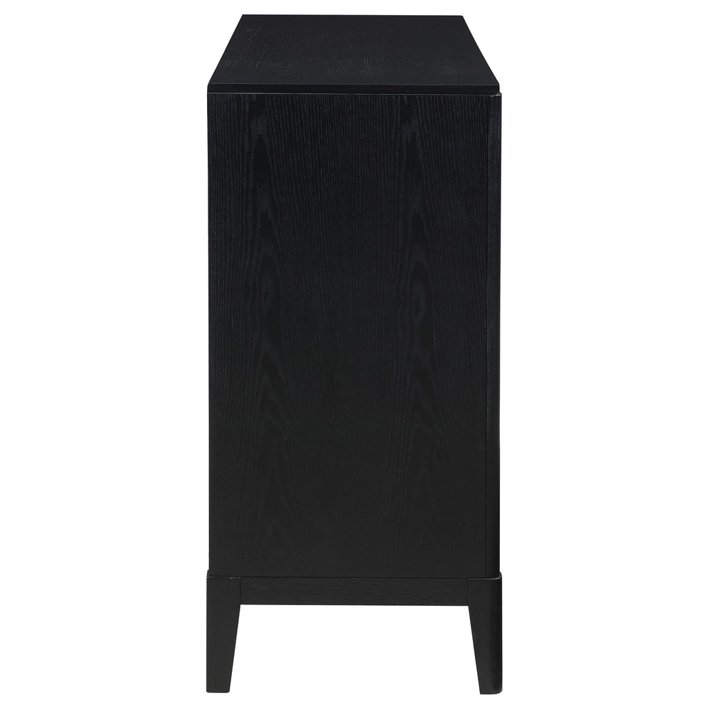 Create a single place to organize clothing and accessories with a stylish, modern eight-drawer dresser. Its timeless stance is augmented with a black finish complete with wire brushing that creates subtle texture and dimensionality. Drawer fronts offer fluted texturing, creating a sense of depth and movement. Half-moon drawer pulls complete the look with a soft golden metallic finish that gleams in the light and adds impeccable warmth. Top drawers include felt lining to protect your delicates, while lower drawers are larger, perfect for everything from sweaters to linens.