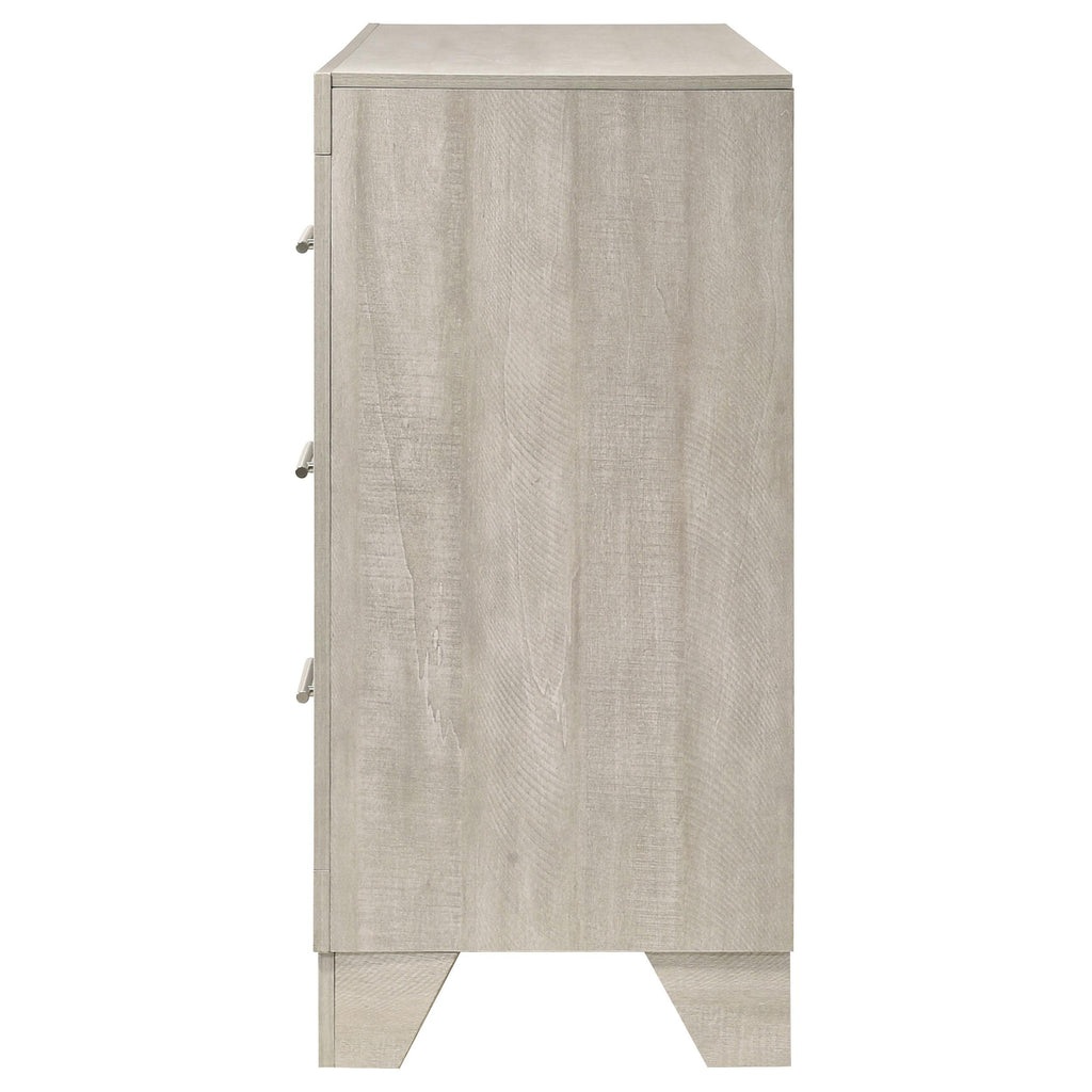 This six-drawer dresser combines modern style with a rustic edge, creating the perfect balance of elegance and functionality for your bedroom. With a rustic cream finish over rough-sawn, white-washed engineered paper veneer, it exudes a warm yet contemporary feel. The extra-wide polished nickel handles add a sleek contrast, enhancing its sophisticated look. Constructed from durable engineered wood, the dresser features English dovetail joinery and Center metal glides, ensuring smooth operation and lasting quality. Its spacious drawers offer ample storage to keep your space organized and stylish.