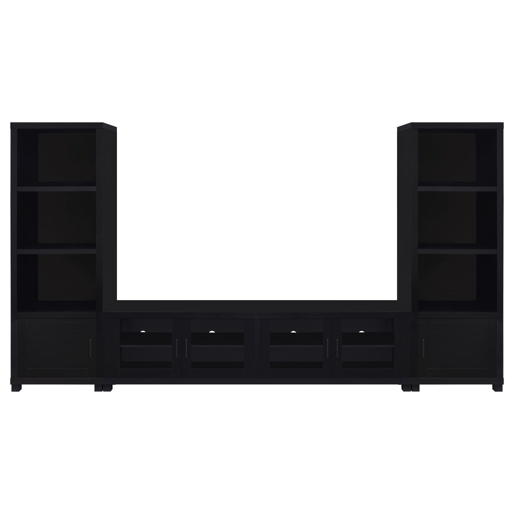 Transform your living room into the ultimate entertainment hub with this sophisticated three-piece entertainment center. Anchored by a commanding 79-inch TV stand, this set is designed to accommodate up to an 85-inch television, bringing a cinematic experience right into your home. The TV stand features four doors that open to adjustable shelves, perfect for organizing your media devices, gaming consoles, and more. Flanking the TV stand, two sleek media towers offer additional storage and display options, with open shelving for your favorite books and decor, and a concealed cabinet for hidden storage. Finished in a striking black hue, this entertainment center blends modern elegance with functional design, creating a seamless and stylish focal point in your living space.
