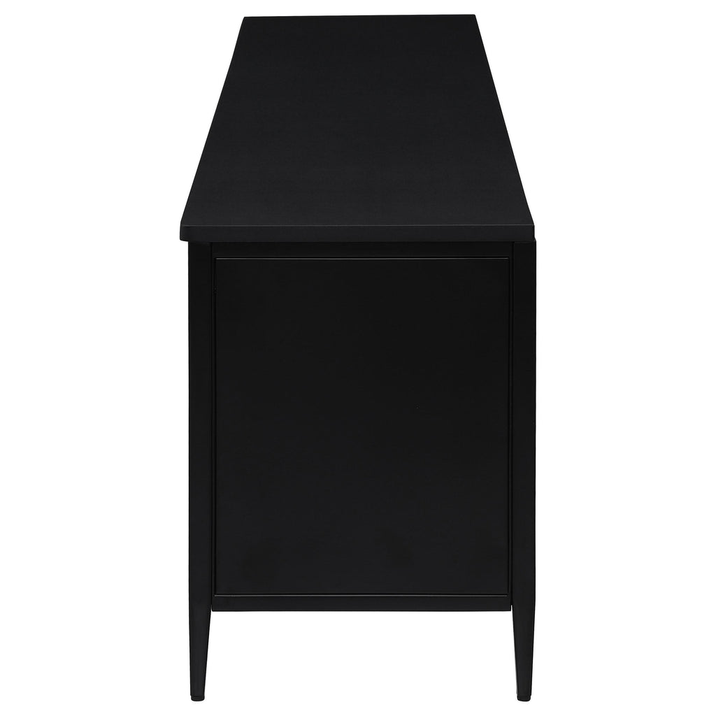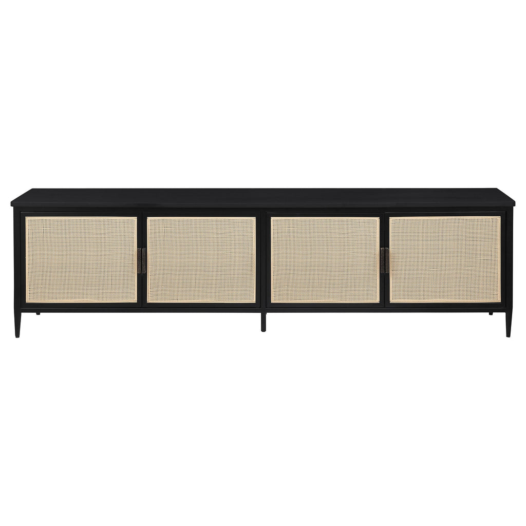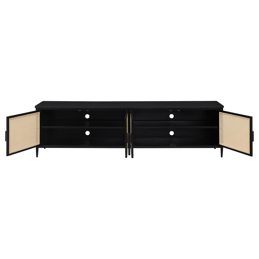 Upgrade your entertainment space with this stunning 78-inch TV stand, designed to accommodate up to an 80-inch TV. Featuring four door cabinets with elegant radio weave polyethylene (PE) rattan fronts, this stand combines modern style with natural texture. The sturdy metal frame, coated with a sleek black powder finish, ensures durability while maintaining a contemporary aesthetic. Inside, two cabinets offer fixed shelving with four total compartments, each equipped with cable access to keep your devices organized and tidy. This TV stand blends style and practicality, making it a perfect addition to any sophisticated living room.