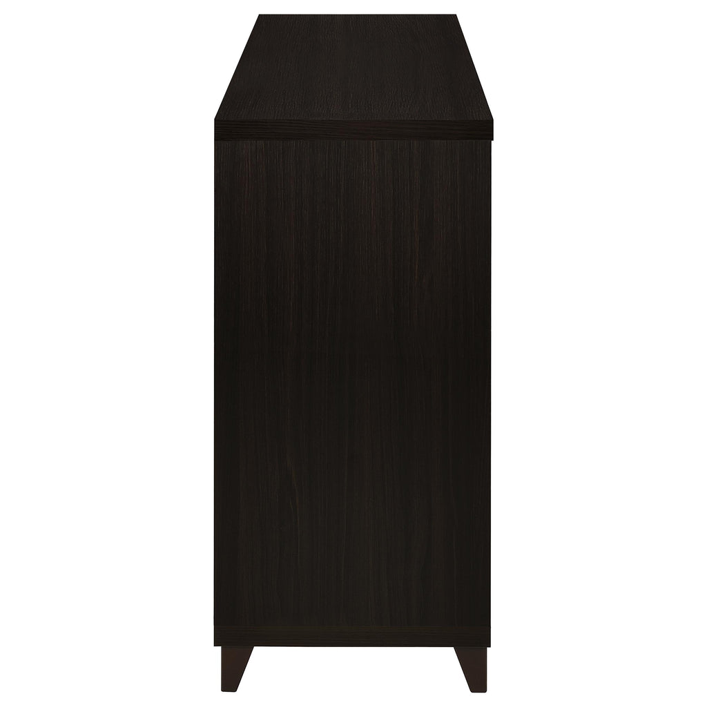 Designed for both storage and display, this 60-inch TV stand combines elegance with everyday function. Finished in rich cappuccino, it features a wide surface that supports televisions up to 65 inches. Two framed clear tempered glass doors reveal adjustable shelving for media players or decor, while three spacious center drawers provide concealed storage for movies, games, or accessories. Brushed silver hardware and tapered legs add a refined touch, making this entertainment center a stylish and practical anchor for your living room._x005F_x000D_ Key Features: • Cappuccino 60-inch TV stand with modern silhouette and brushed silver hardware • Surface accommodates televisions up to 65 inches for versatile entertainment use • Two framed clear tempered glass doors reveal four adjustable storage shelves • Three spacious drawers provide concealed storage for movies, games, or devices • Constructed from engineered wood with scratch-resistant laminate veneer finish • Euro drawer glides and tapered legs ensure smooth function and lasting durability
