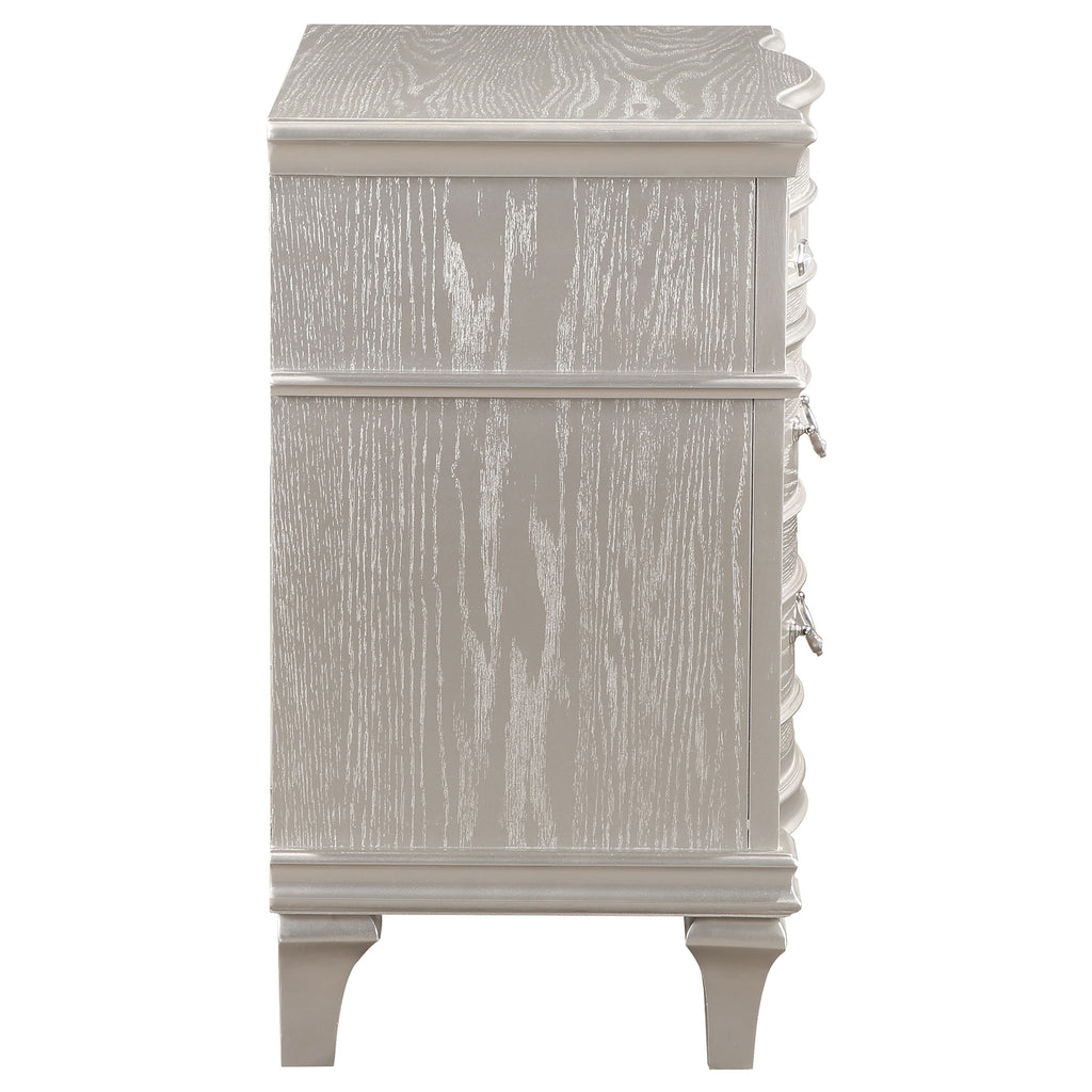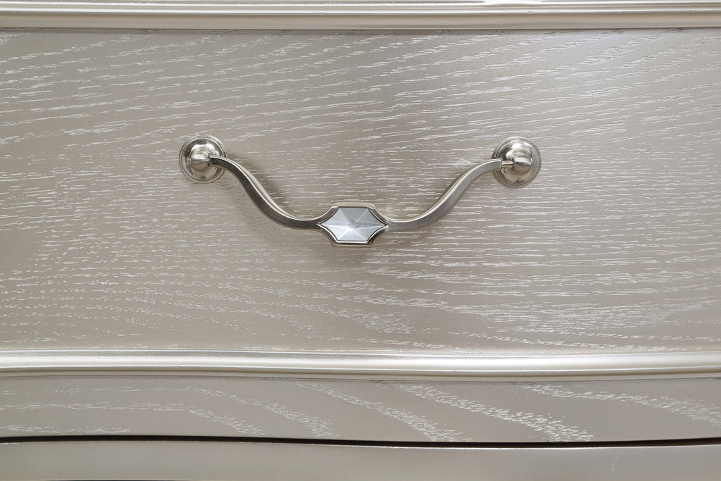 Keep all your bedroom essentials and wardrobe items neatly organized with this glam three-drawer nightstand. A contoured frame design features sparkling side panels flanking the three spacious drawers for a luxurious touch. A silver oak finished wood frame is accented further by modern glam metal knobs and bail handles that help slide each drawer with ease. A soft grey felt-lined top drawer invites you to store more delicate items. A hidden USB outlet creates a convenient charging area for handheld devices.