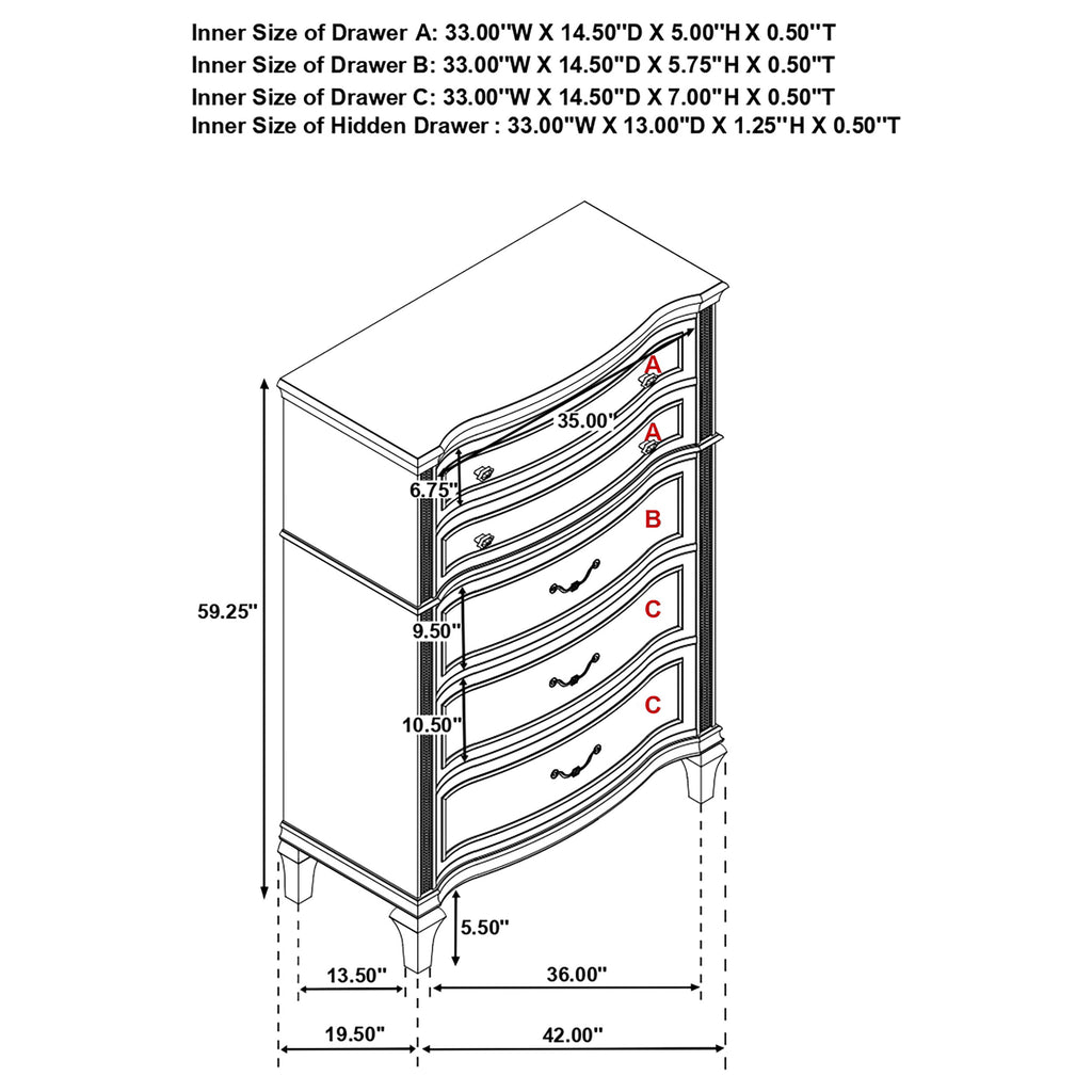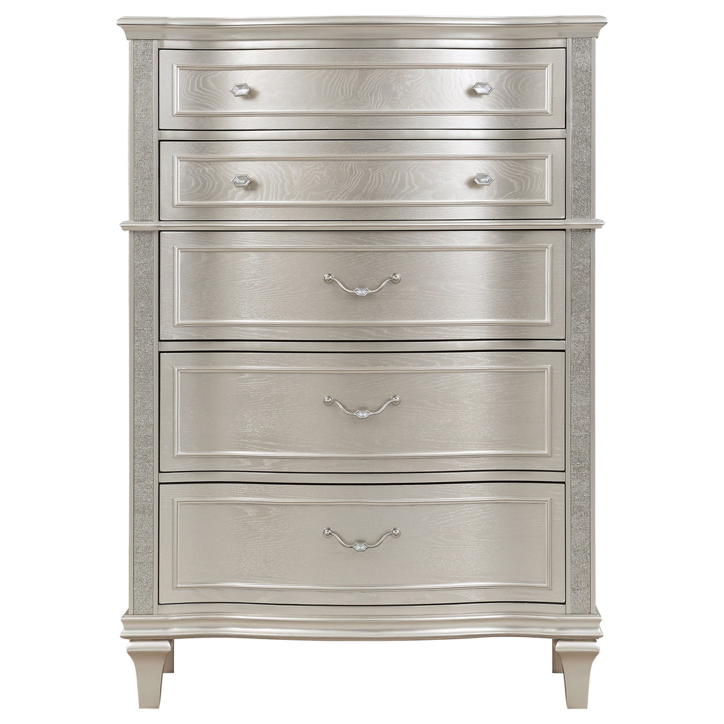 Elevate your guest room or main bedroom with this breathtaking glam chest. The space-saving tall design boasts a curvy front facade, seen throughout the wavy wood trim appointed drawer panels. Five spacious drawers offer ample space for all your bedroom necessities, along with a soft grey felt-lined top drawer for more delicate items. A silver oak finish covers the entire chest frame as slender glittering side panels lend a luxe modern flair. Hexagon-shaped knobs and hexagon-accented drop bail pulls offer a finishing touch.
