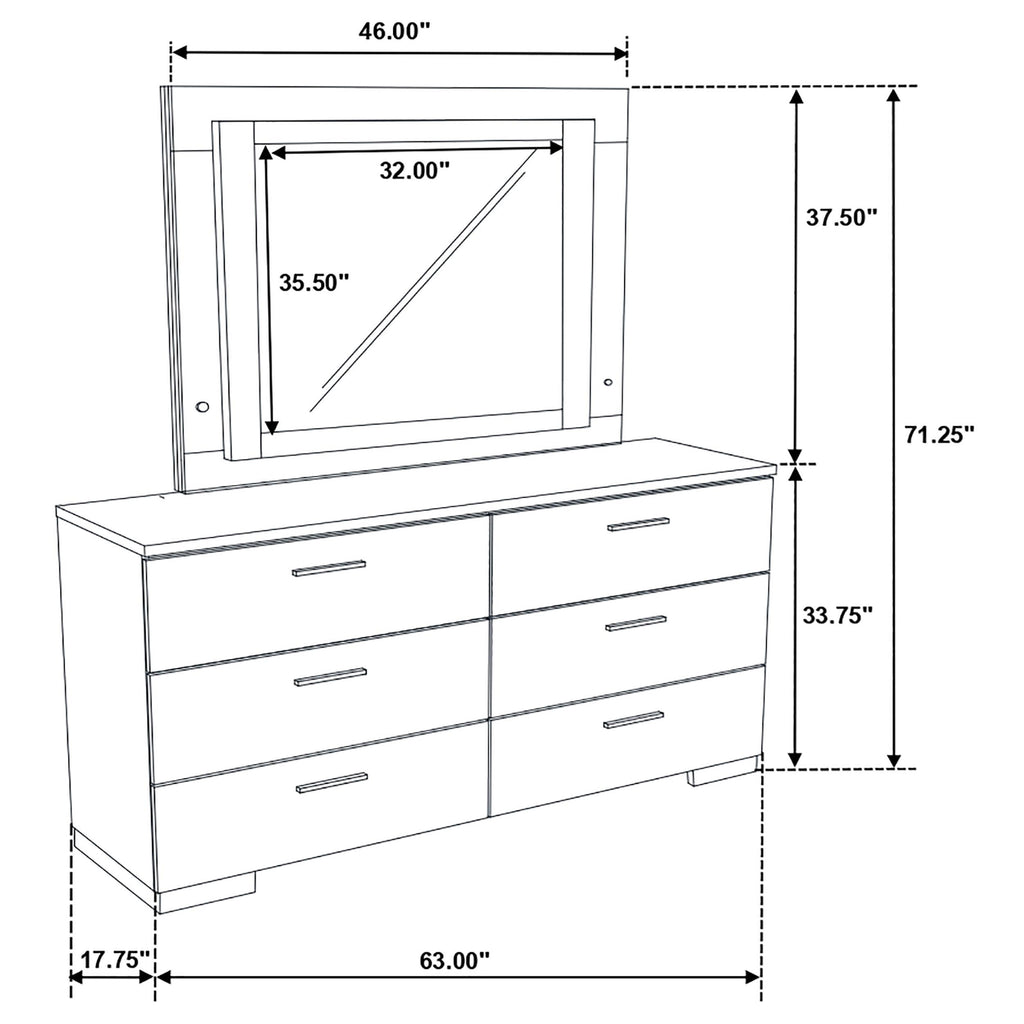 Upgrade your bedroom with this dresser and LED mirror set designed for modern living. The six-drawer dresser offers streamlined storage with a polished white high gloss finish and chrome-finished accents. Paired with a matching mirror featuring integrated perimeter LED lighting and a touch-activated switch, this set delivers both style and convenience. Smooth-gliding drawers complete the ensemble with everyday functionality.