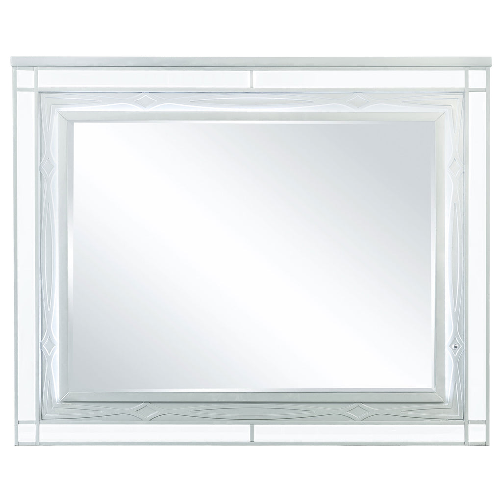 Transform a bedroom into a stylish sanctuary. This stunning, five-piece bedroom set is a truly exquisite choice with its elegant fretwork and dramatic decorative accents. The metallic leatherette headboard flaunts crystal button tufting for a touch of bling. The headboard and mirror are traced with blue LED light for soft ambiance. The nightstand, chest, and dresser feature decorative drawer fronts and provide plenty of storage space for a neat and organized personal space.
