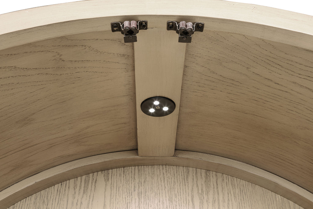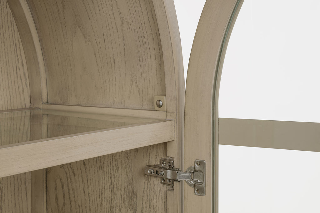Elevate your space with this sophisticated vitrine cabinet, designed to showcase your most treasured items with style. Featuring two wood-framed tempered glass doors, the upper section offers four tiers of shelving, perfect for displaying decor, dinnerware, or collectibles. The lower section of the cabinet provides additional storage with two hand-woven cane doors and a shelf inside for hidden organization. Crafted from solid wood, engineered wood, and oak veneer, this display cabinet offers both open display and concealed storage options. Its timeless arched design and natural wood finish make it a perfect addition to dining rooms, living spaces, or home offices.