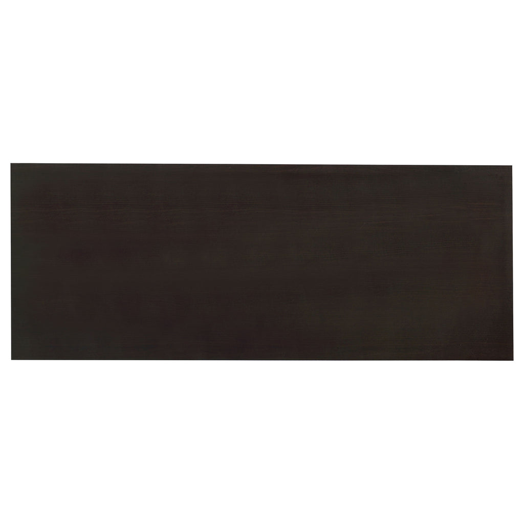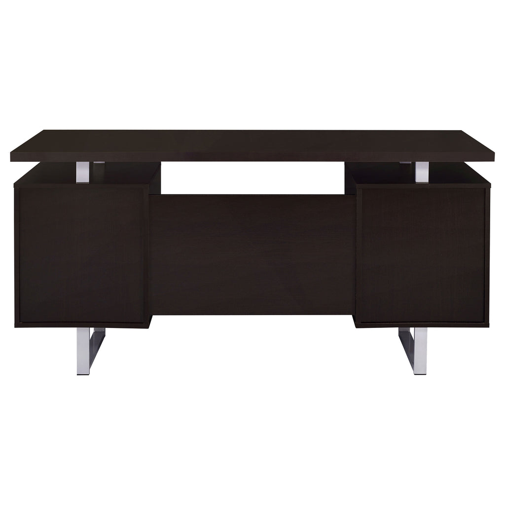 Enjoy an intriguing architectural design in this office desk. A floating top creates a visually enticing effect and a completely different look. Finished in cappuccino, it flatters surrounding decor and delivers a dramatic touch. Store essentials in a cabinet and drawer, and use a file cabinet to organize papers. Contrasting silver hardware and steel legs plays up the contemporary flavor of this stylish desk. Key Features: • Classy office desk in cappuccino finish • Clean metal base in silver finish • Simple desk includes one (1) storage cabinet, one (1) storage drawer, and one (1) file cabinet • File cabinet holds both legal and letter size files • Metal, MDF, particle board, and laminate construction