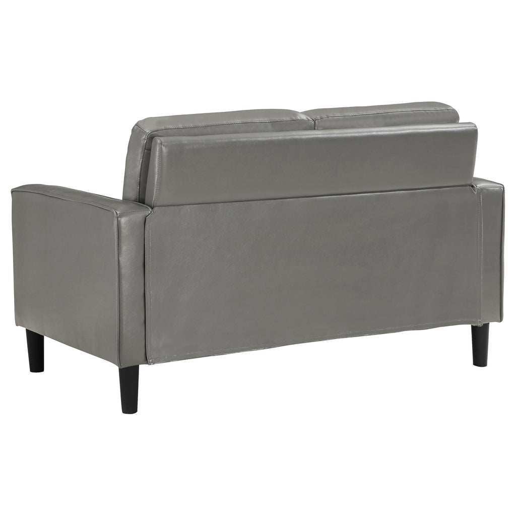 Take a no-fuss approach to your living room decor with the coordinated sophistication of a modern three-piece sofa set that includes a sofa, loveseat, and armchair. Each piece is defined with a structured silhouette and square track arms. Its simple, refined look includes smooth faux leather upholstery, offering a pleasing seating experience with plush cushions. Each piece sits on straight, tapering legs that create a touch of height for an airy, modern look and feel in your living room. Seating is supported with sinuous springs and webbed decking add support behind attached back cushions for optimal comfort.