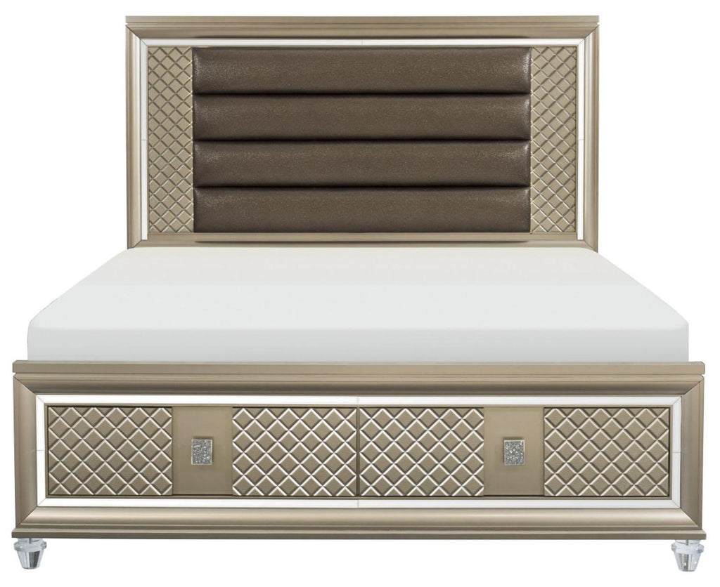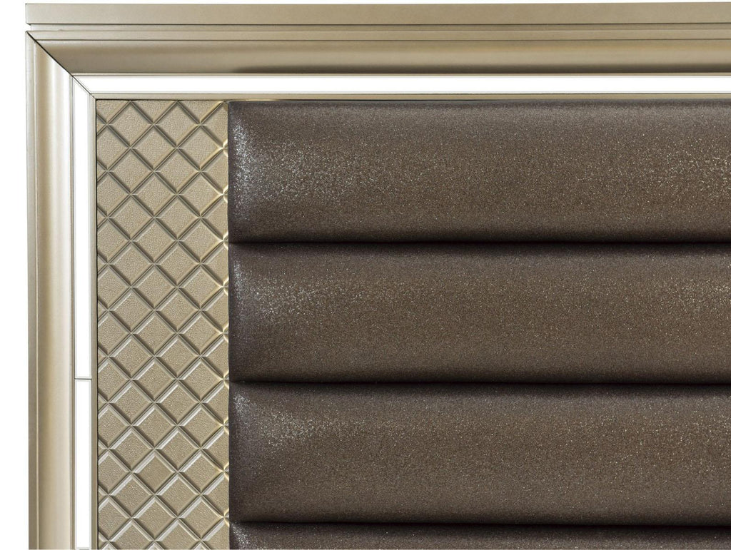 The striking design of the Loudon Collection presents as a bold statement of your glamorous inclinations. The champagne metallic finish of the Eastern King bed shimmers with LED back-lighting the headboard with additional sparkle coming in the form of the black glass encrusted drawer pulls on the storage footboard, embossed diamond pattern of the mindy veneer, mirrored framing and acrylic feet.