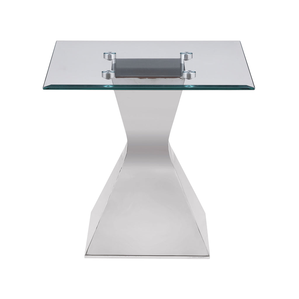 Introduce stylish allure with this modern end table, showcasing an hourglass-inspired base in a polished silver finish. Constructed with stainless steel and tempered glass, it features a square top with a beveled edge, adding dimension and refinement. The clear glass highlights the sculptural design of the base, reflecting light and creating visual intrigue. Perfect for modern interiors, this table combines bold artistry and functionality to elevate any living space.