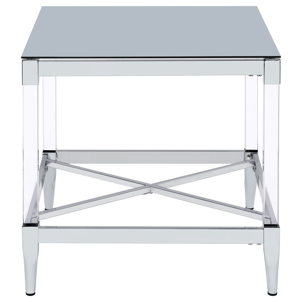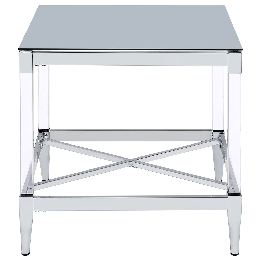 Gracing the side of your favorite armchair, this end table is a masterpiece of reflective beauty and modern design. The mirrored tempered glass top offers a dynamic surface that reflects light and life around it. Clear acrylic leg posts provide a sense of spaciousness, while the chrome-electroplated steel frame enhances its contemporary allure. Resting on tapered feet, this elegant table is a perfect balance of chic style and functional grace, ideal for urban and modern interiors.
