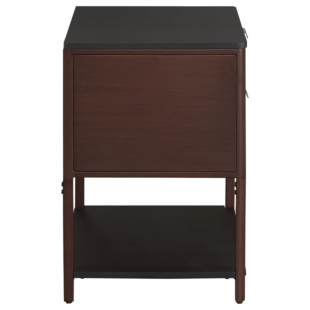 Enhance your living space with this versatile side table, which can also serve as a stylish bedside table. Its two spacious drawers feature elegant fluted detailing, adding texture and sophistication to your décor. The sturdy metal frame, finished in a rich hue, ensures durability, while the lower open shelf provides convenient storage or display space. Whether beside your bed or next to a sofa, this table effortlessly blends practicality and style. Its sleek design and functionality make it an essential piece for both modern and traditional settings.
