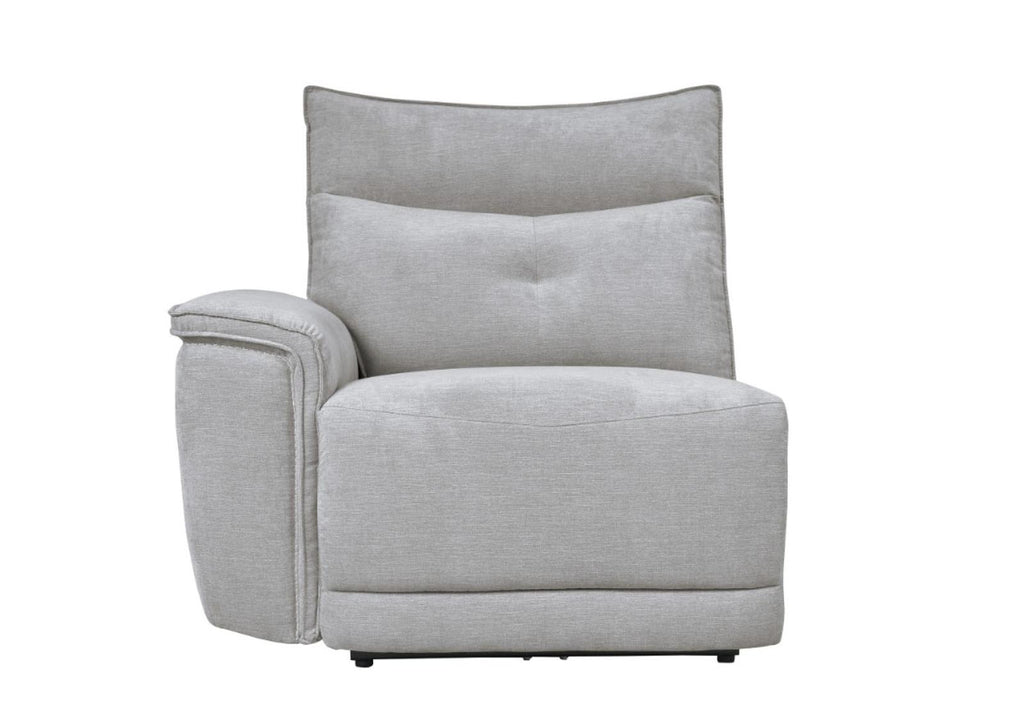 Providing ample seating in modern form the Tesoro Collection. The classic sectional shape is book-ended by end recliners – allowing for maximum versatility when planning the layout of your living room. Mist gray fabric provides a neutral palette for your decorative preferences. The reclining mechanism of the reclining ends and armless chair brings you to your desired position. Providing additional support is console unit - with storage and stainless steel cup holders.