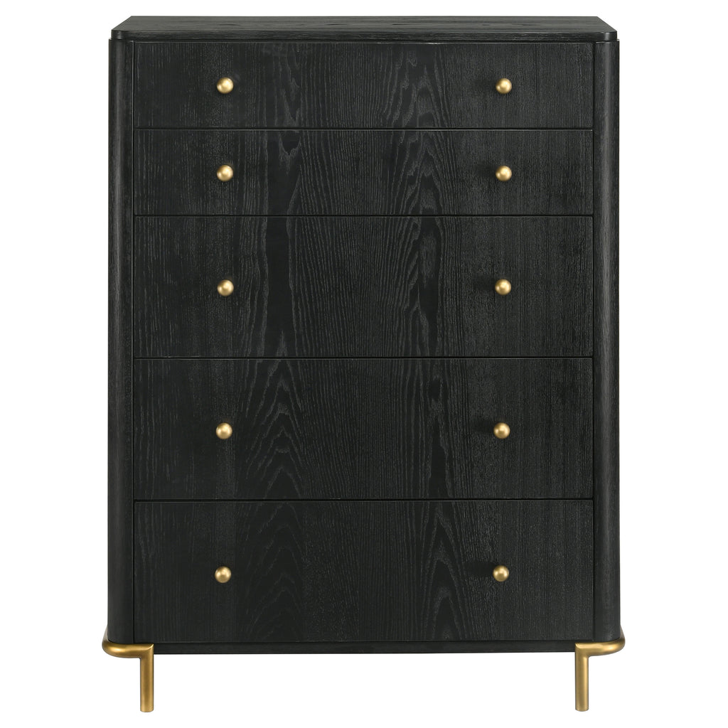 Enhance storage and style in your bedroom with a modern five-drawer chest. Impeccably designed, it features a classic silhouette complete with rounded corners that create a softened effect perfect for a soothing space. The chest offers five drawers for easy and accessible storage, and each is decorated with a pair of petite round knobs in a golden finish. A crisp black finish is wire brushed to create texture, enhancing the wood grain look of this chest. Gold finish legs match the hardware for a cohesive look and the top is perfect for decor.