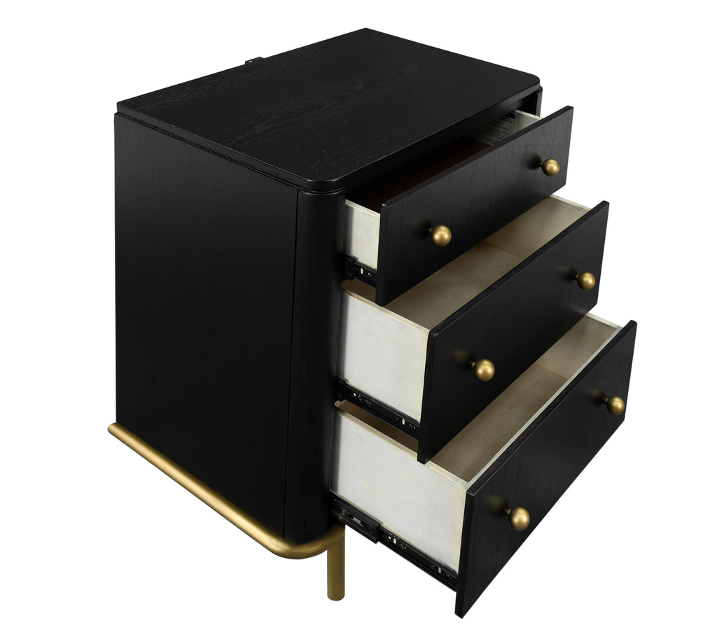 Put a fresh spin on your bedroom with the addition of a modern nightstand. Its three drawers provide plenty of storage at your bedside, great for books and personal items. The top drawer includes felt linking top protect important items, and a built-in USB port adds access for easily charging your phone overnight or while lounging in bed. The nightstand features a crisp black wire brushed finish that enhances its wood grain details, and gold finish ball knobs and legs add the perfect dose of contrasting warmth. Rounded corners soften the silhouette while a generous top is just right for a reading light or decor.