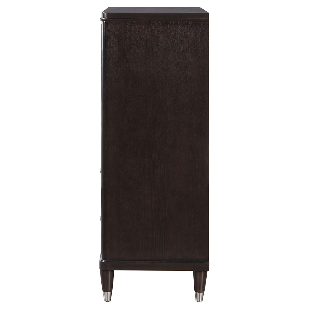 Gleaming knobs and foot caps add contrast and character to a modern five-drawer chest. Its deep brown finish is sleek and refined, perfect for a stylish bedroom with sophisticated presence. Its five drawers offer abundant storage. The top drawer includes felt lining and the bottom drawer is lined in cedar for additional protection for delicate items like jewelry and seasonal sweaters. The top of the chest is perfect for decor, offering a spot for a personal touch in your bedroom.