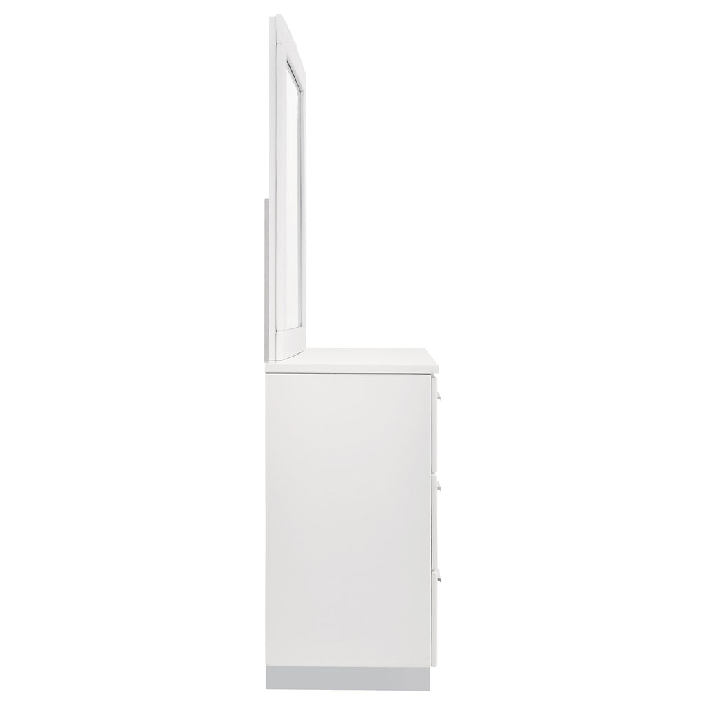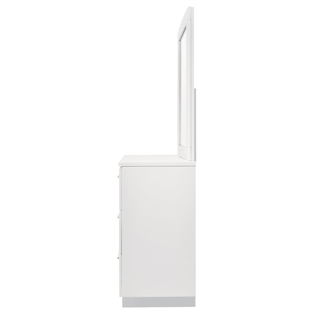 This dresser and mirror set brings streamlined function to contemporary bedrooms. The six-drawer dresser offers ample storage with smooth metal extension glides, while the mirror features a white high gloss frame that reflects light and complements the dresser’s modern silhouette. Chrome-finished handles and feet enhance the look with refined detail, making this set a practical yet stylish addition to your space.