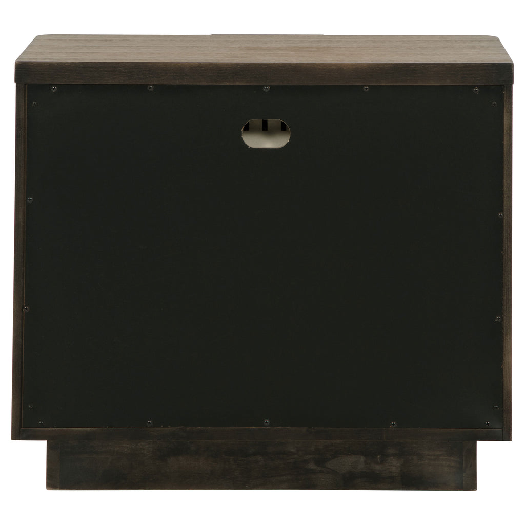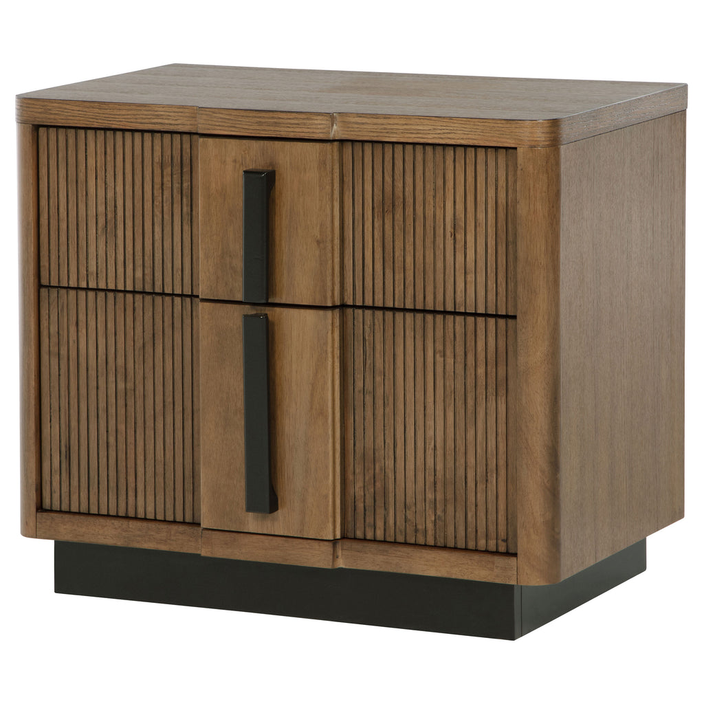 Introduce a decorative touch and plenty of convenience with a modern two-drawer nightstand. Crafted in wood, it receives a cool ash brown wood grain finish with distinctive dark drawer pulls and a matching recessed base. The drawers offer ample storage at your bedside, while the nightstand's top creates the perfect spot for a reading lamp and a choice of great books or decor. The drawer fronts feature vertical fluting that's echoed in its bar pulls, creating a sense of movement and depth. The case is complete with rounded front corners for a seamless presentation at your bedside.