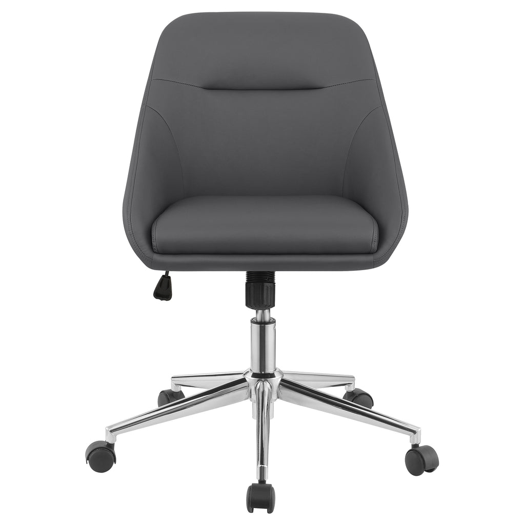 Wrapped in soft and smooth leatherette, this modern office chair features contoured edges for an elegant, contemporary silhouette. Lean against the supportive, comfortable backrest as you focus on work and other tasks. The seating also features a pintuck design and sloped armrests that lend a clean look that is easy on the eyes. Supported by a five-caster wheelbase in a polished chrome finish, this office chair glides across the floor to retrieve office supplies and effortlessly slides beneath a desk at the end of the day. A pneumatic lift also allows you to adjust the height for a more ergonomic seating position. Key Features: • Wrapped in soft and smooth leatherette, this modern office chair features contoured edges for an elegant, contemporary silhouette with a pintuck design and sloped armrests • Supportive and comfortable backrest allows you to lean against it while focusing on work • Five-caster wheelbase in a polished chrome finish glides across the floor and slides beneath a desk • Pneumatic lift allows you to adjust the height for a more ergonomic seating position • Eyes-pleasing design with clean look