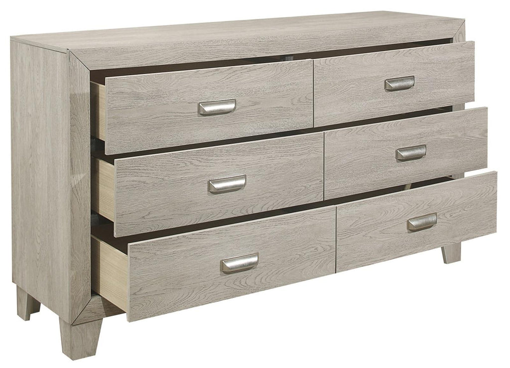 The modern styling of the Quinby Collection is achieved by blending the natural look of wood grain and the clean lines of contemporary design to create a unique bedroom group that will fit right in with your home’s aesthetic. The embossed faux-wood grain of the dresser is perfectly complemented by the subtle contrast of the nickel-finished metal fixed drawer pulls and the clean, defining lines of the framing.
