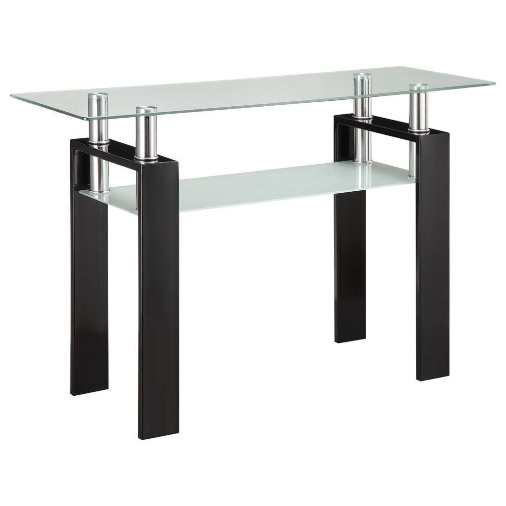 This rectangular sofa table features a clear tempered glass top and a frosted tempered glass shelf for additional storage or display. Supported by a durable metal frame, the console table boasts a modern and sleek design that fits seamlessly into contemporary living spaces. Its minimalist aesthetic combines functionality with style, making it an ideal piece for your home or office.