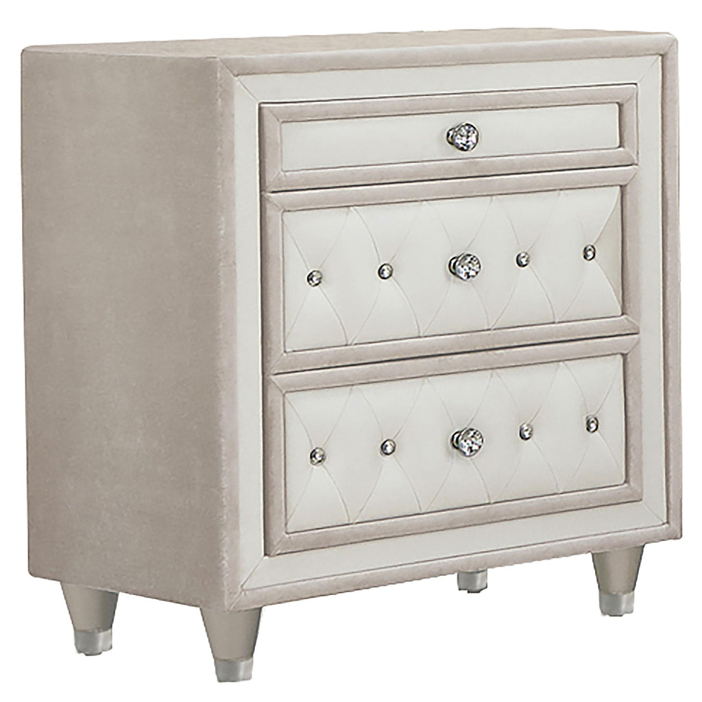 With French Provincial decor in mind, this upholstered nightstand has everything you need for an elegant bedroom. It's a three-drawer nightstand that offers storage space for small bedside essentials. Beautiful button tufting on the drawers is enhanced with crystal-like buttons. Tapered legs add yet another elegant touch to this ivory and camel nightstand. Place it by your bed and watch your sleeping space instantly transform.