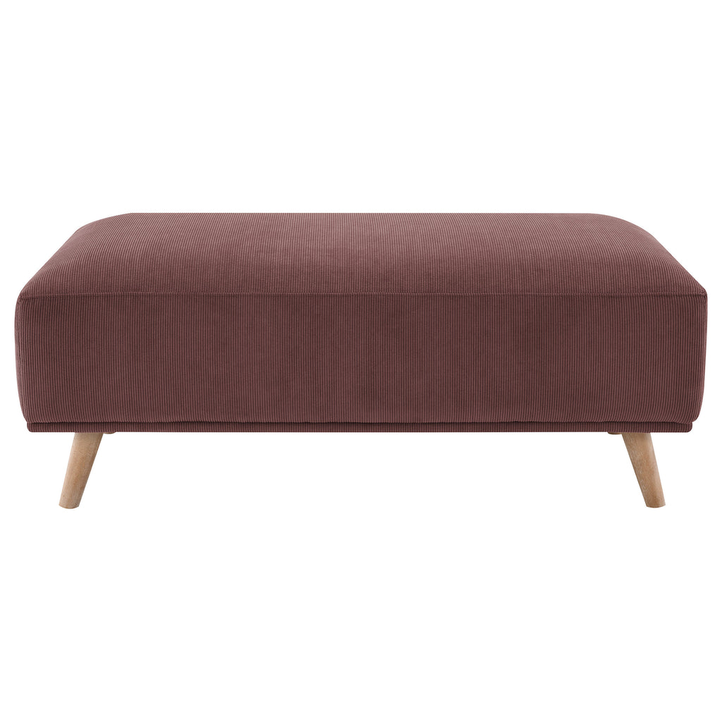 Complete your inviting sitting area with the richness of a modern ottoman. It showcases red wine upholstery, adding depth and the richness of a lovely jewel tone to your living room. It features a rectangular silhouette with plush padding, offering a footrest, seat, or tabletop. The upholstery is trimmed at the base, adding tailored flair. The ottoman is complete with tapered, splayed wooden legs with a light finish that adds contrast and depth.