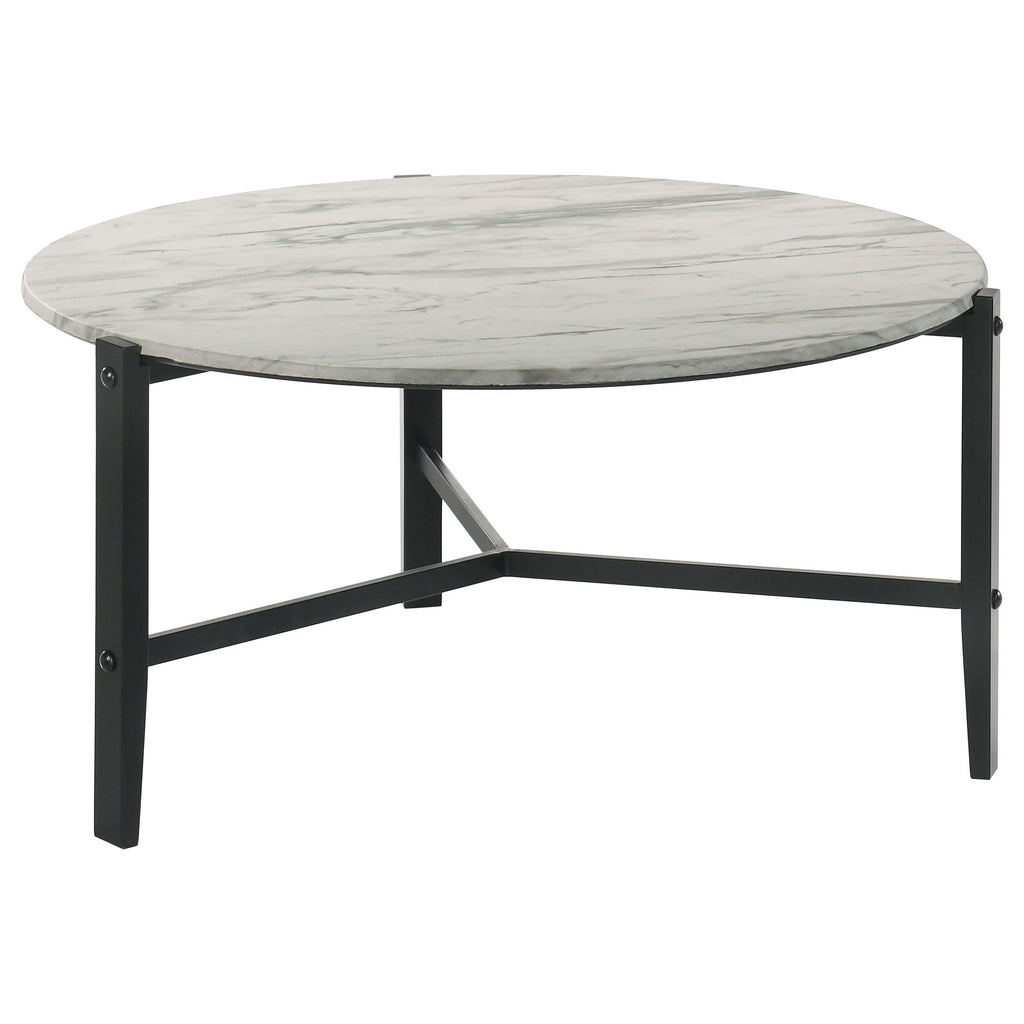 This modern coffee table set combines sleek lines with a minimal aesthetic. Slim black solid rubberwood legs form a stand-like base, supporting round tops with a floating effect. The high-pressure laminate tops showcase a faux white marble finish with textured surfaces and natural striations, offering both visual interest and durability. Scratch-resistant, burn-proof, and break-proof, this occasional table set provides ample surface space for decor, beverages, or lighting, blending effortlessly with various interior styles.