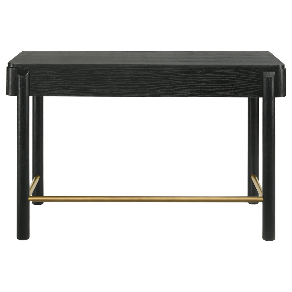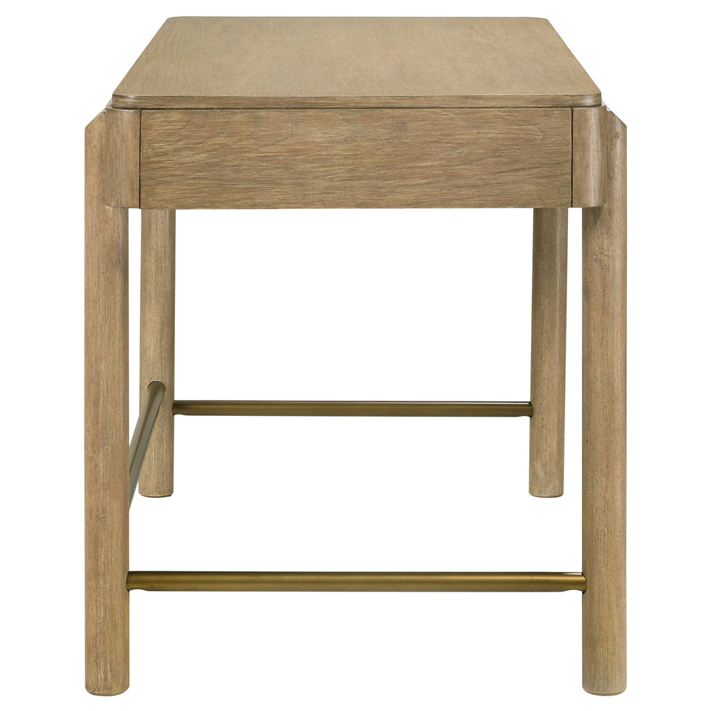 Complete your bedroom or living area with a multi-functional modern coastal vanity desk with a hint of glam personality. Its soft sand finish is rich but neutral, complementing in virtually any setting and showcasing wood grain details. Two drawers create plenty of space, perfect for stashing cosmetics and accessories or desk supplies. Gold finish ball knobs accentuate the drawer fronts, while front legs extend across the desk's apron to create a sense of depth and dimension. Add a mirror to turn this table into a spot for hair and makeup, or bring your laptop and work from home.