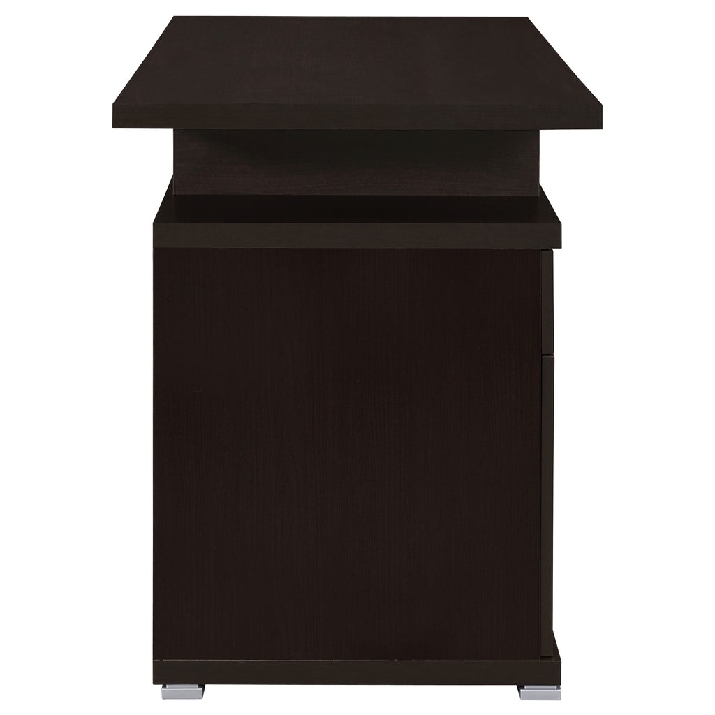 Maximize efficiency in any workspace with this sleek office desk. Designed with a reversible configuration, the attached storage can be placed on either side to suit your layout. A spacious desktop provides room for projects, while a storage drawer and a file cabinet keep essentials neatly organized. The file drawer accommodates both letter and legal-sized documents for versatile use. Built with engineered wood and laminate veneer, this desk blends durability with modern style for home or office settings._x005F_x000D_ Key Features: • Cappuccino finish office desk with sleek modern design and compact footprint • Reversible configuration allows file and drawer unit on either desk side • Includes one storage drawer and one file cabinet for practical organization • File drawer accommodates both letter and legal size document storage needs • Built with engineered wood and laminate veneer for durable everyday use • Silver finish hardware accents provide a clean contemporary design detail