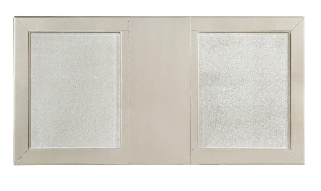 Blending traditional lines with modern glamour is the Crawford Collection. Finished in an eye-catching silver, the dining table will be a dramatic addition to your home’s dining room. Cabriole legs and insert glass panels lend traditional accent.