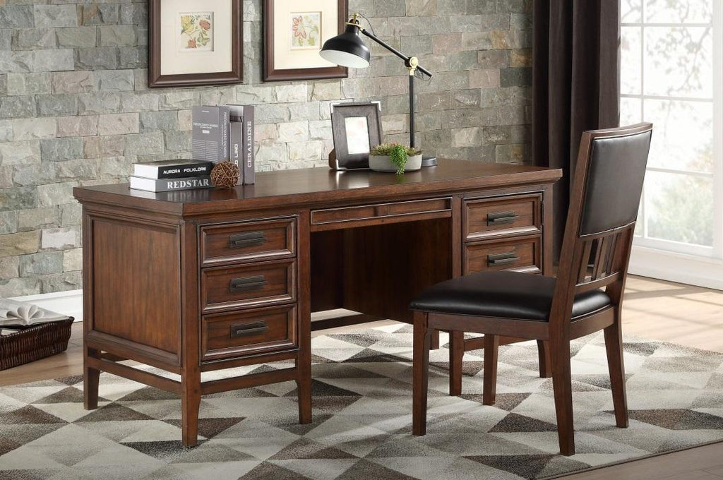 With a subtle lodge look that takes inspiration from design history, the classic styling of the Frazier Park Collection will help you create a home office environment that is a reflection of your preference for traditional spaces. The brown cherry finish that highlights the mindy veneer provides rich character to the wood’s grain. Horizontal fixed knob hardware fronts the functional drawers and doors of the executive desk creating subtle contrast to the collection’s finish. The executive desk provides ample tabletop - with keyboard tray - for your big projects while allowing for drawer and behind door storage to keep your office necessities out of sight. Writing desk and bookcase are also available.