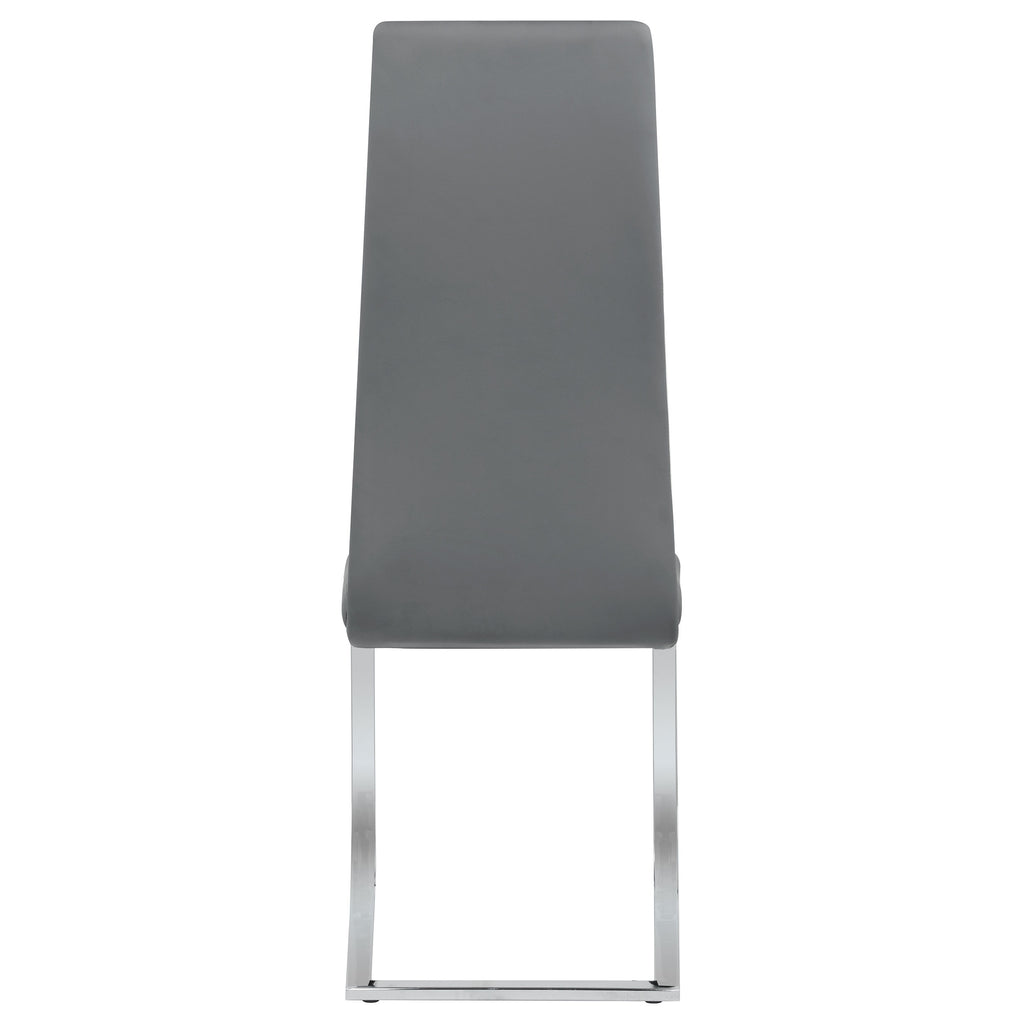 This set of four side chairs add a modern touch to a contemporary dining space. Each contemporary dining chair features an elongated backrest that is reminiscent of the iconic Breuer design, further lending to its modern flair. Invite guests over for a long evening of dinner and drinks, knowing they are comfortable and supported by an ergonomic curved backrest wrapped in a foam-filled grey leatherette. A padded seat features a waterfall front edge that falls elegantly into a U-shaped chrome finish frame and leg supports. In addition, this set of four chairs is available to suit your current color palette, offered in multiple colors to suit your tastes.