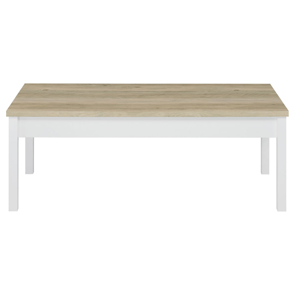 An updated version of farmhouse style is soft and easy on the eyes as this three-piece wood coffee table set is a viable option for your family room or living room. Casual and yet nicely designed, this set offers a versatile finish palette of distressed pine and white over wood products. Clean lines add an easy optical effect. Make your space a simple yet stylish venue with tables designed to last through redesigns. Set includes one rectangular coffee table and two end tables. Key Features: • Three-piece occasional table set featuring a coffee table and matching end tables for versatility • Distressed pine finish tops bring a warm rustic charm that blends effortlessly with modern decor • White base provides a clean and contemporary contrast to the rustic distressed pine finish • Built from engineered wood, plywood, and eco-friendly veneer for strength and durability • Straight, simple lines deliver a timeless design that adapts easily to evolving interior styles • Durable materials and sturdy construction ensure these tables stand up to everyday use