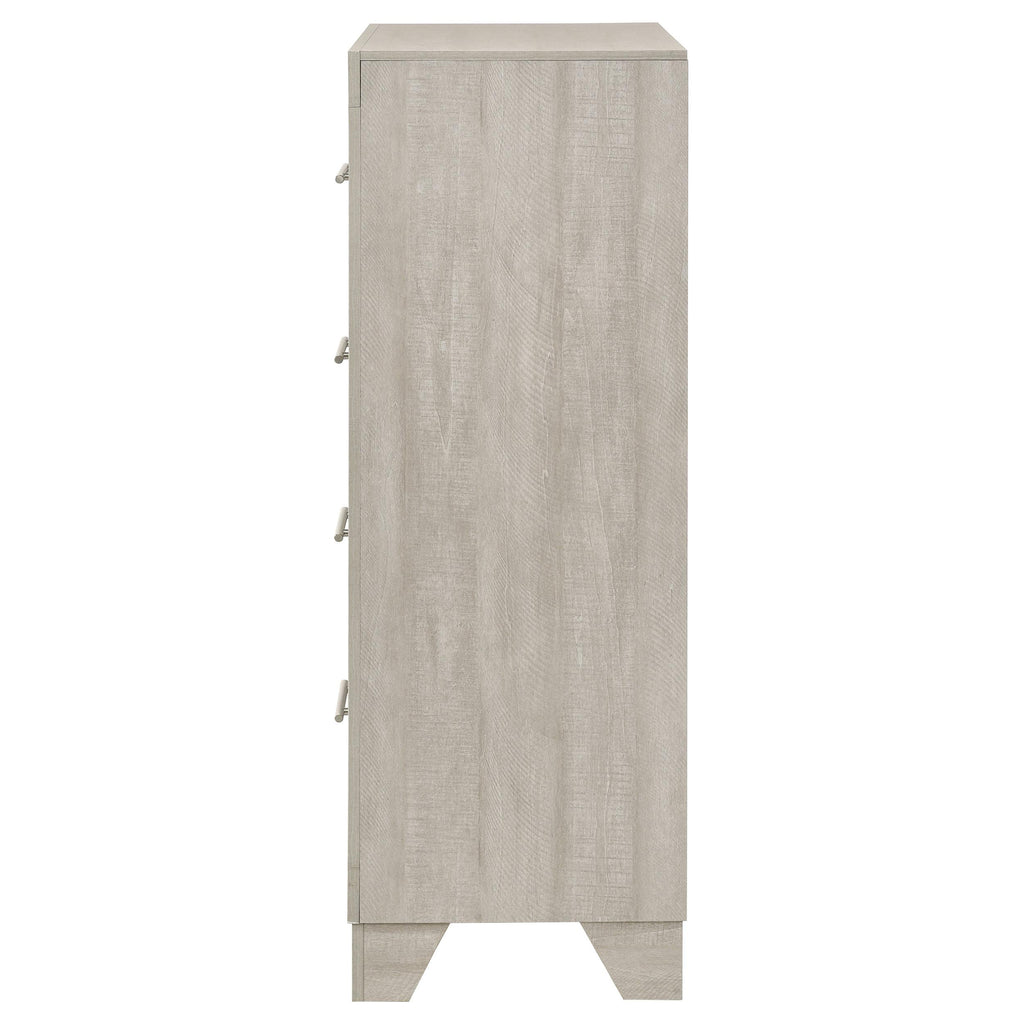 This four-drawer chest offers a stylish combination of rustic charm and modern design, making it a perfect storage solution for contemporary bedrooms. Finished in a rustic cream with rough-sawn, white-washed engineered paper veneer, it has a warm, textured appeal that’s both inviting and chic. The extra-wide polished nickel handles add a sleek, modern touch, creating a subtle contrast. Built with engineered wood, the chest features English dovetail joinery and Center metal glides for durability and smooth functionality, ensuring it meets both aesthetic and practical needs.